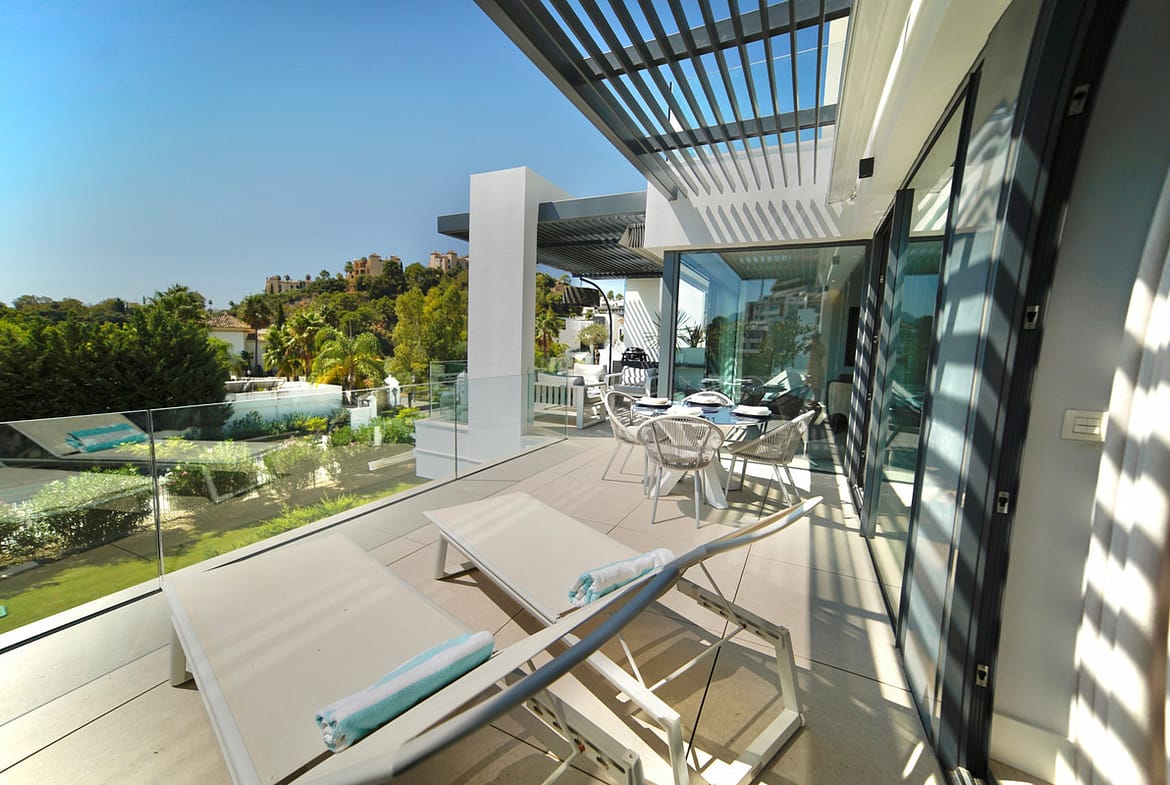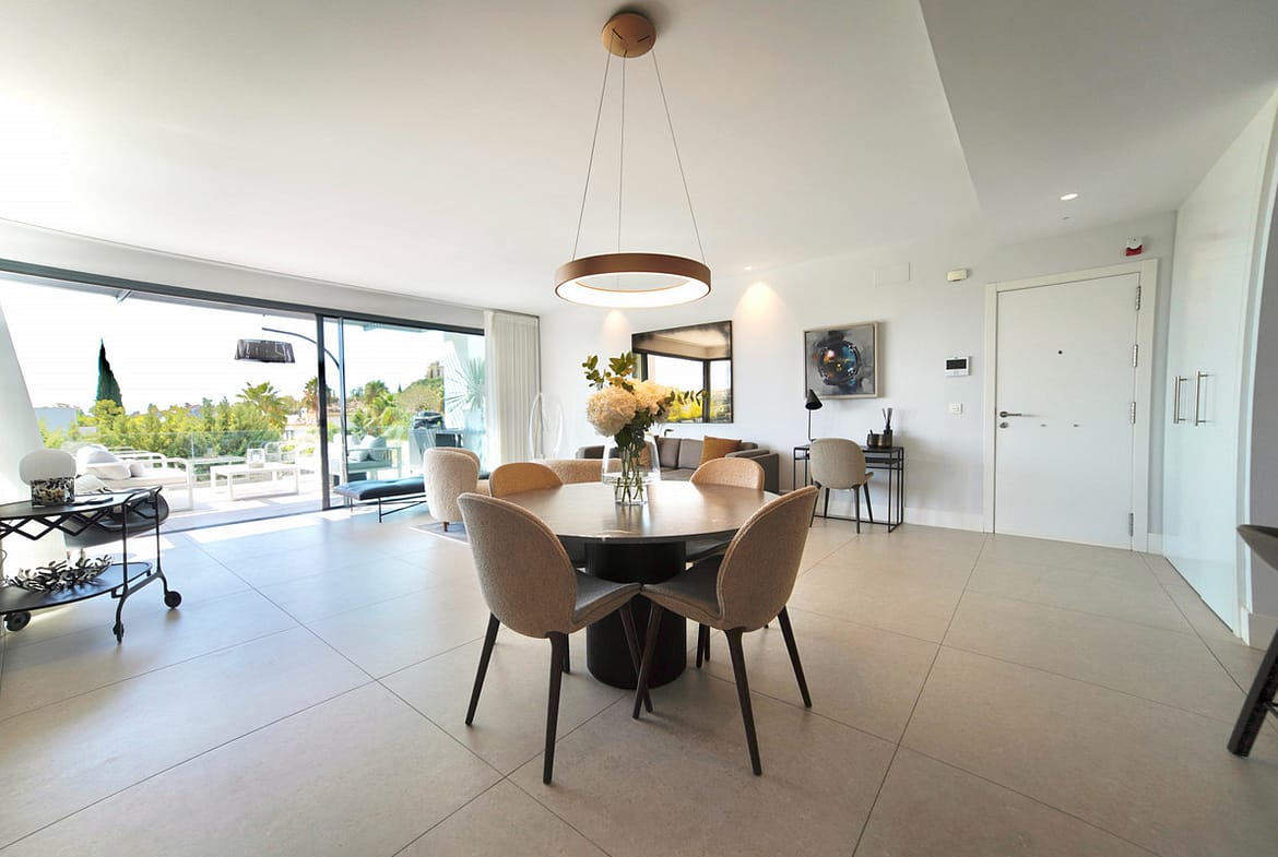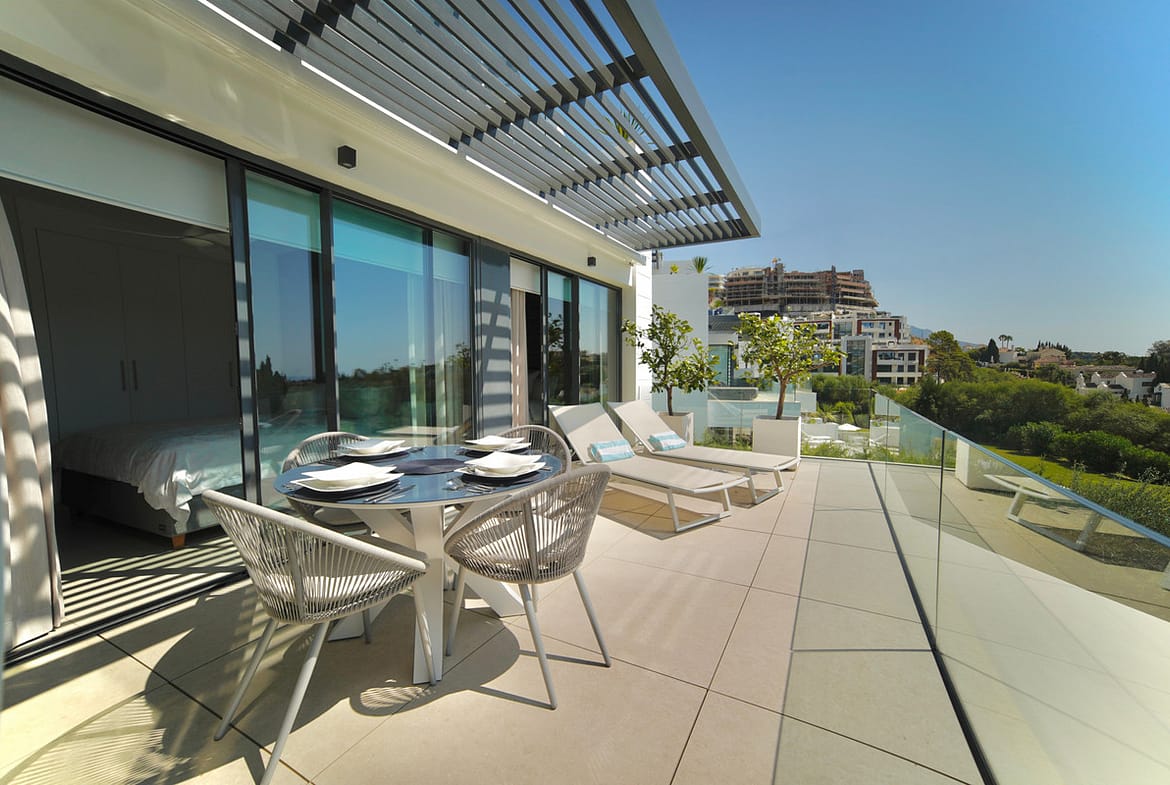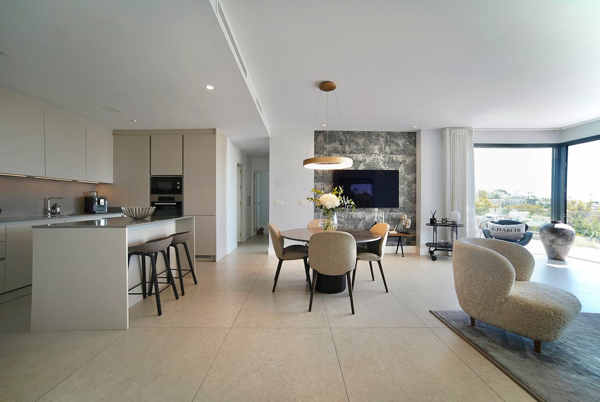 This beautifully designed two-bedroom, two-bathroom apartment offers a harmonious blend of comfort and sophistication in one of the most sought-after areas of the Golf Valley. Located in Urbanization Aqualina wiith 112 m² of interior living space and a generous 43 m² private terrace, the property provides the perfect setting for relaxed living and elegant entertaining.