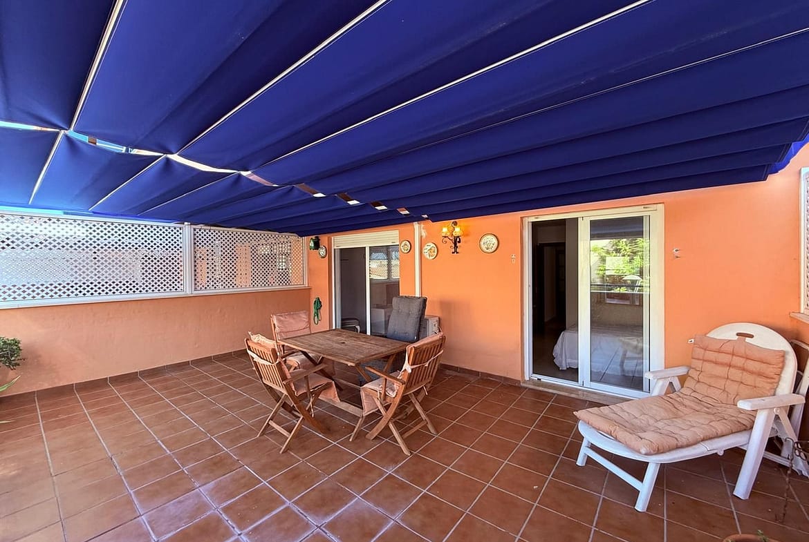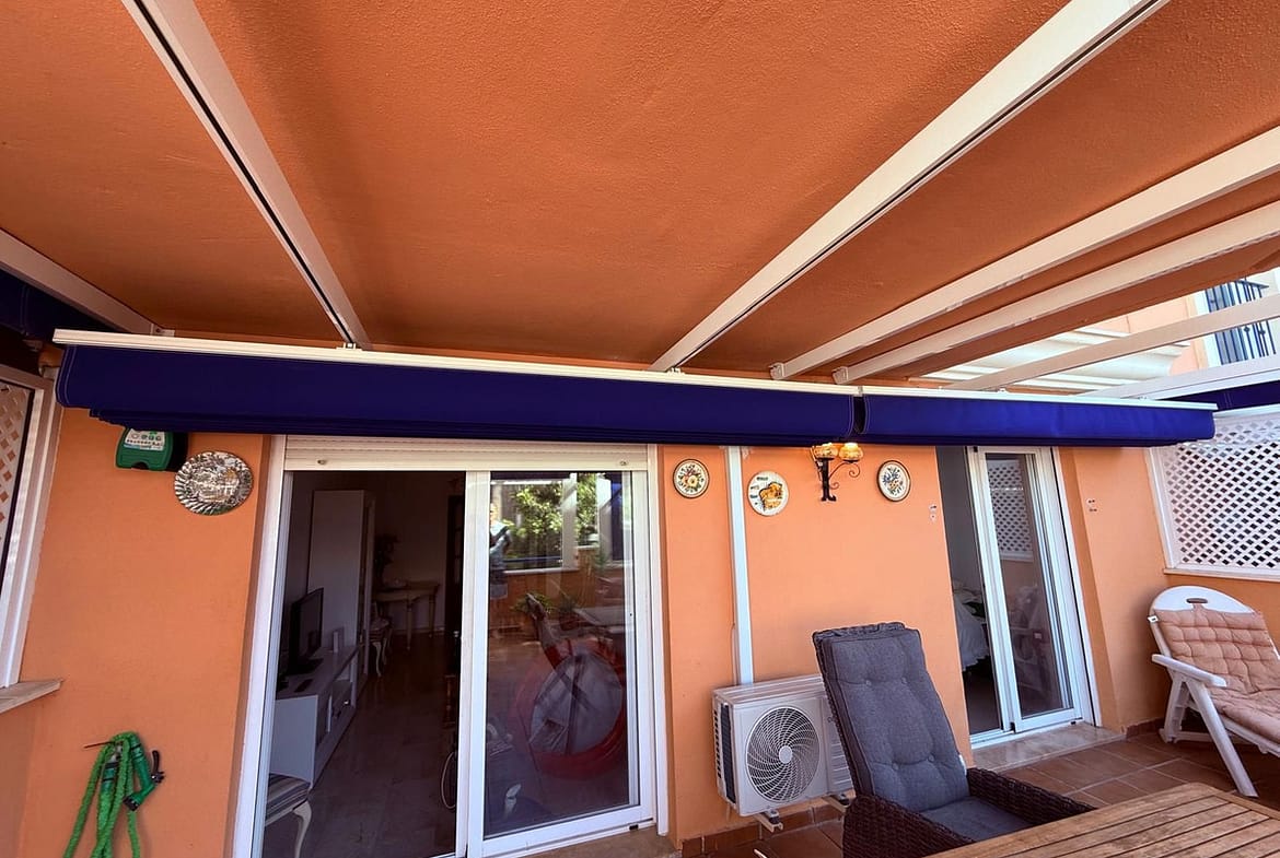 Inside, the welcoming entrance hallway leads to a fully fitted kitchen with a separate utility room. A spacious open-plan lounge and dining area flows seamlessly through patio doors onto a large terrace. Recently upgraded with an electric roof and side coverings, the terrace can be enjoyed year-round as a sunspot, entertaining area, or additional living space – making excellent use of this valuable outdoor area.