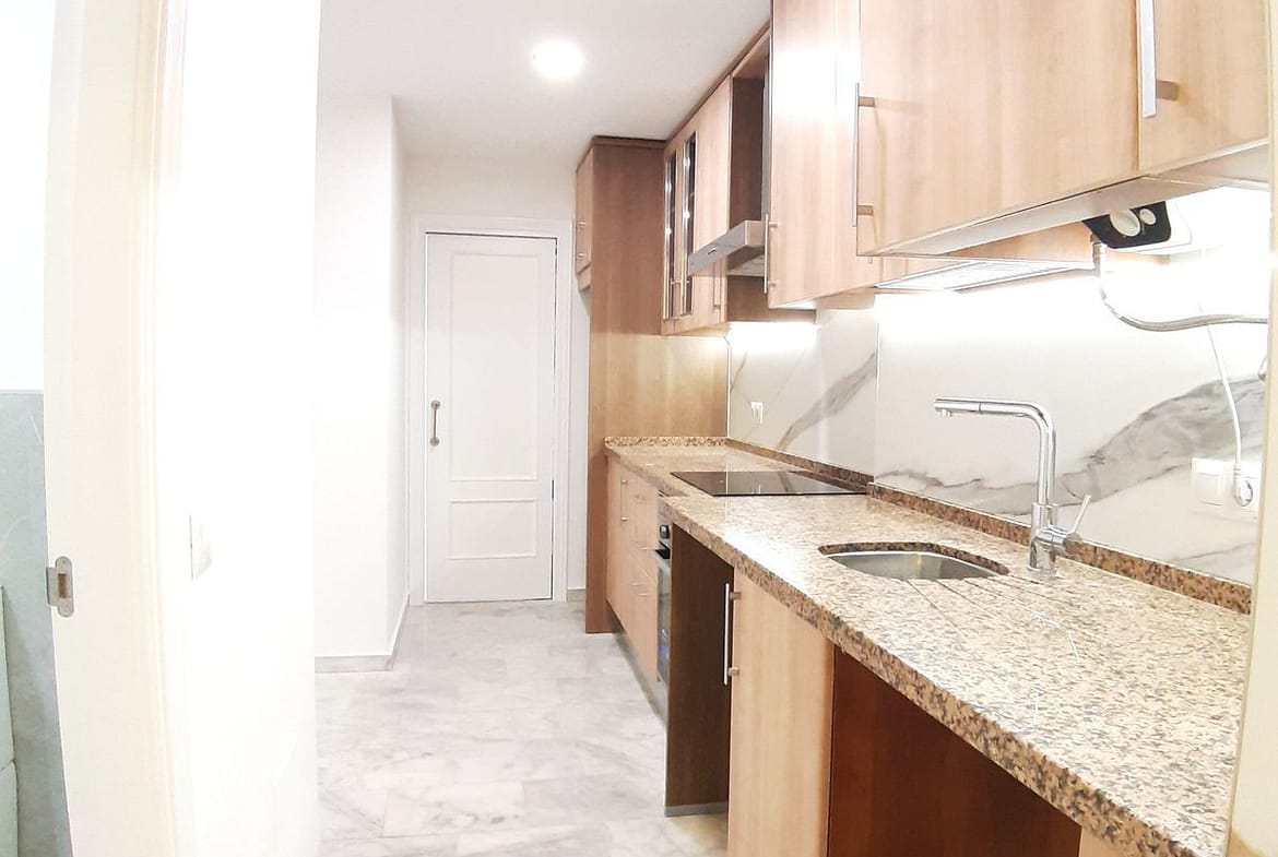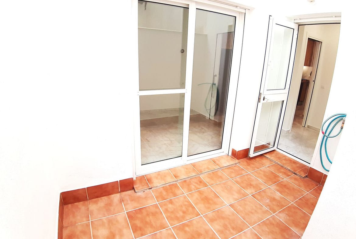 The apartment has 60 m² of living space, distributed into two bedrooms: a master bedroom with a double bed and a built-in wardrobe, and a single bedroom, both with direct access to the private patio. It also features a full bathroom and a brand-new, modern open-plan kitchen, equipped with some appliances, perfect for enjoying the spacious and comfortable living areas.
