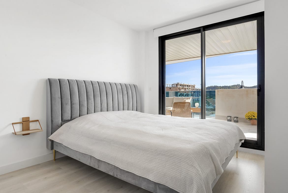The heart of the apartment is the open-plan kitchen, flowing seamlessly into the bright living and dining area. Large sliding glass doors open onto the spacious south-facing terrace, perfect for al fresco dining, relaxing, or enjoying the Mediterranean sunshine. The interiors are light-filled, airy, and designed for modern coastal living, combining neutral tones with high-quality finishes.