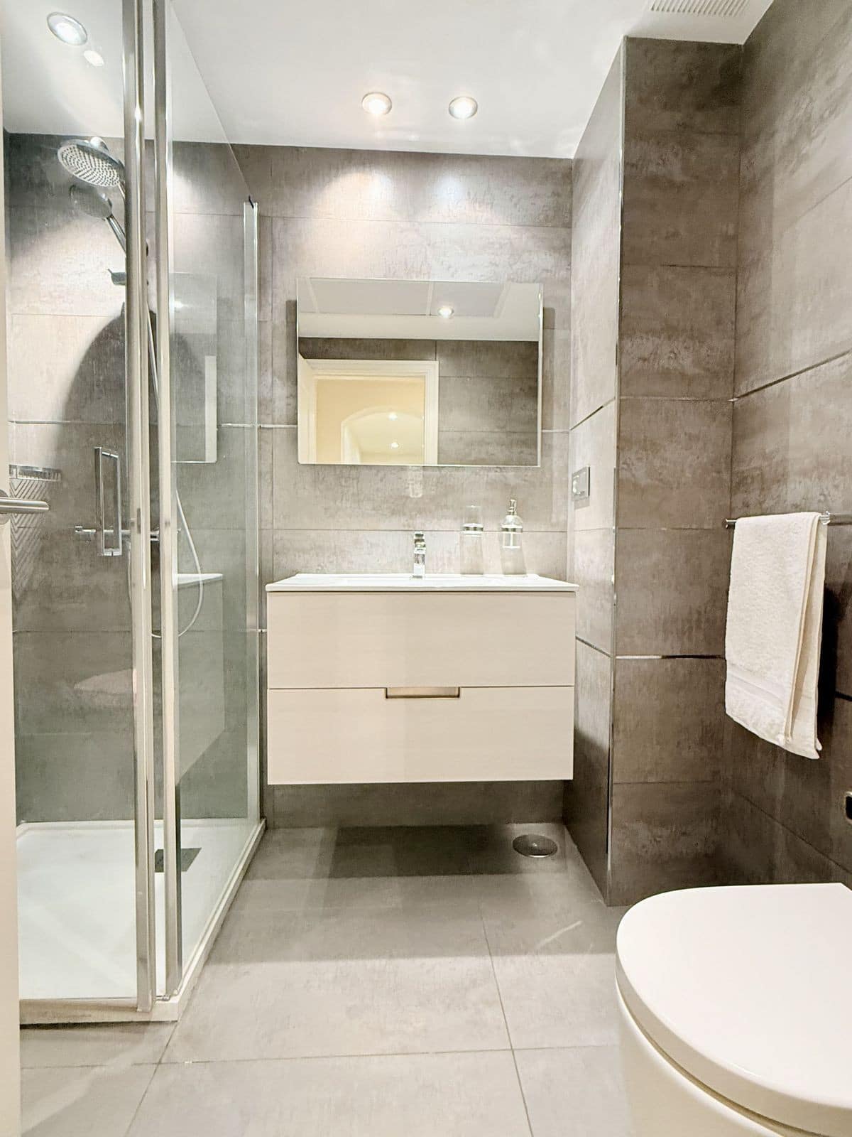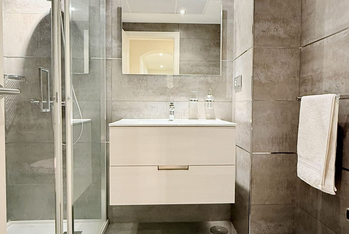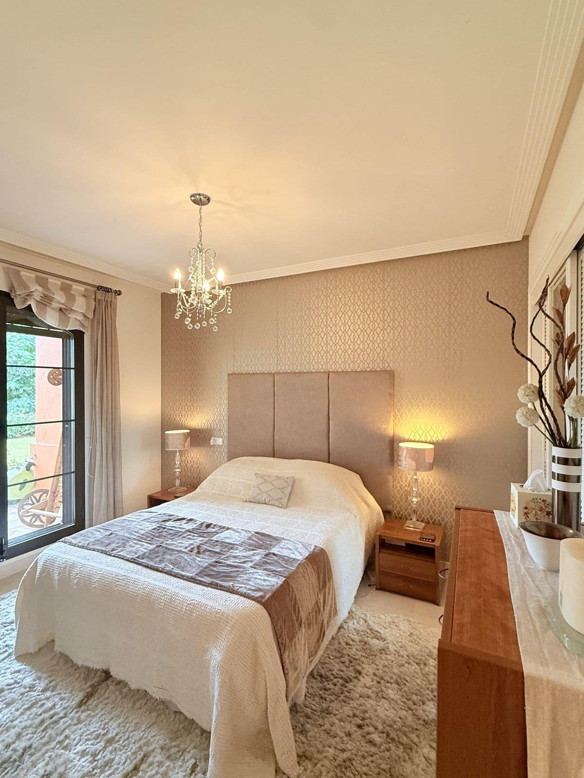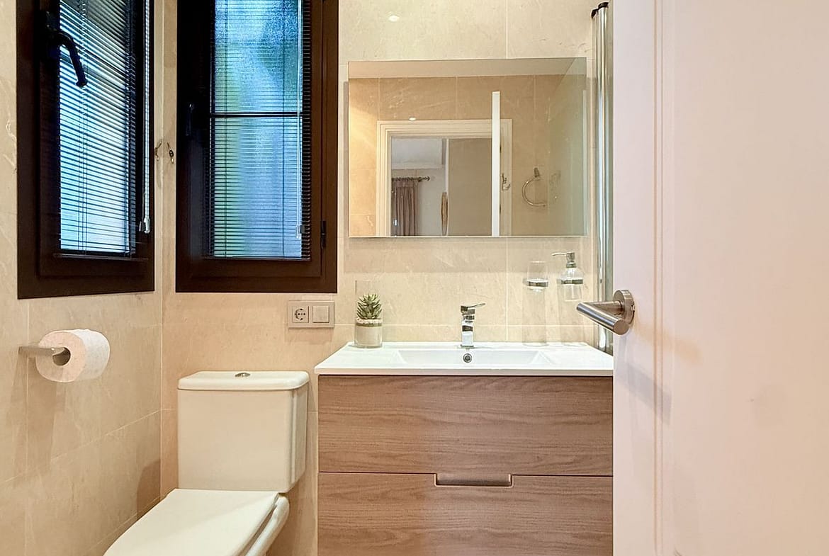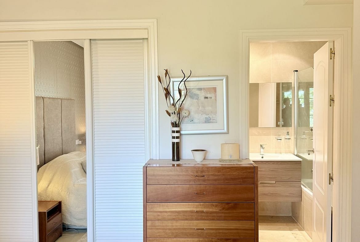 The property includes two spacious double bedrooms. The master suite features an ensuite bathroom with bathtub and direct garden access, while a second full bathroom serves the additional bedroom and guests. Ample built-in wardrobe space throughout ensures excellent storage .