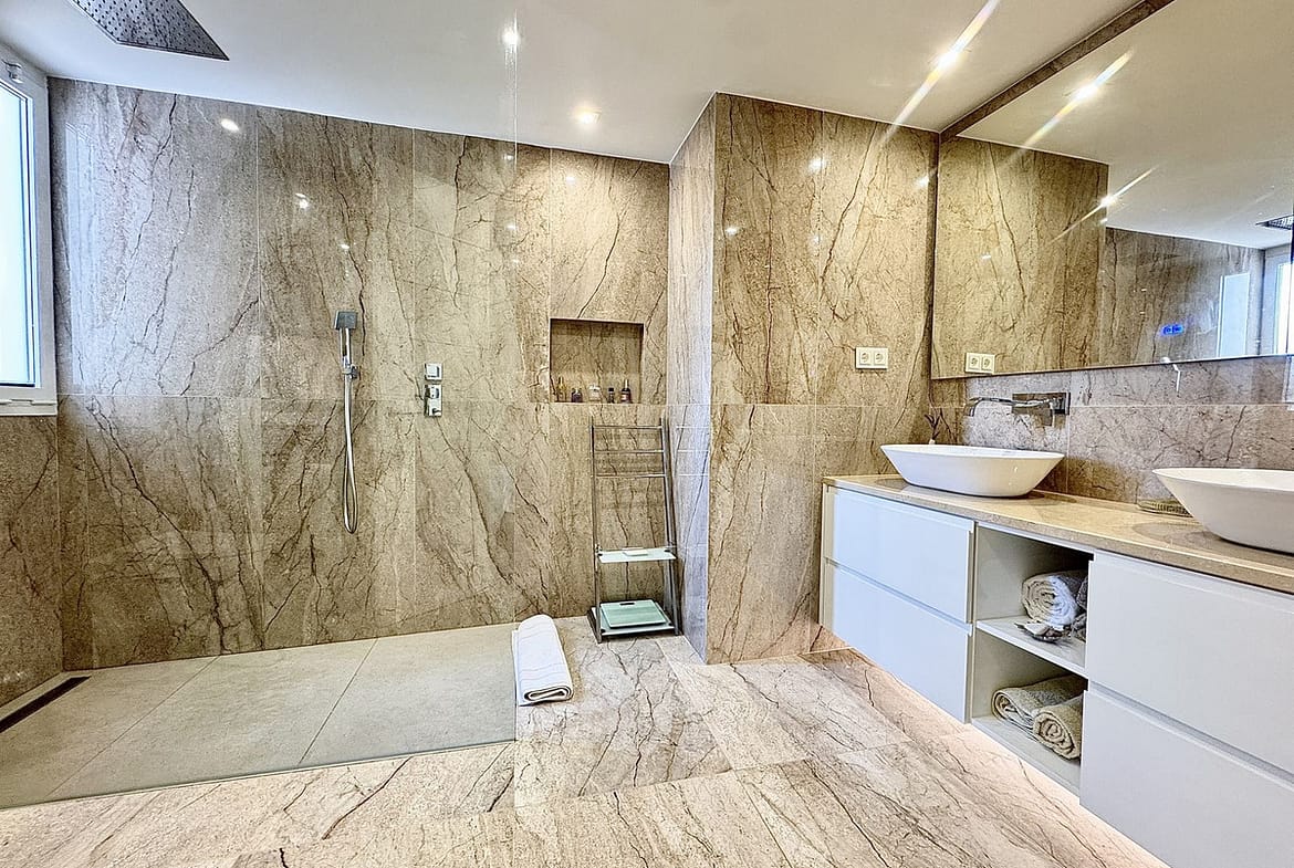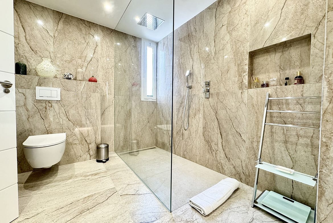 The property features a new open-plan kitchen and refurbished bathrooms with high-quality finishes, offering a modern and sophisticated atmosphere. Large windows with electric shutters and glass curtains on the terrace ensure bright, comfortable spaces all year round.