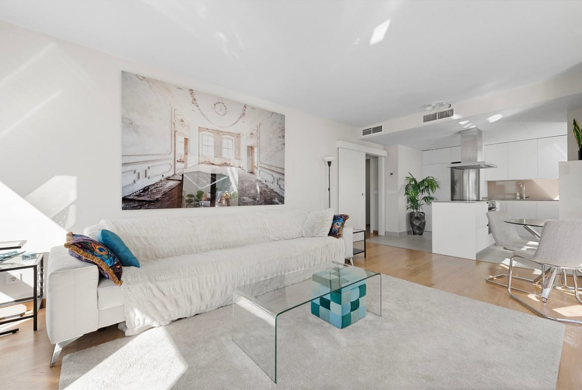 The open kitchen is another attractive feature of this penthouse, designed to integrate perfectly with the living room, fostering a convivial atmosphere.