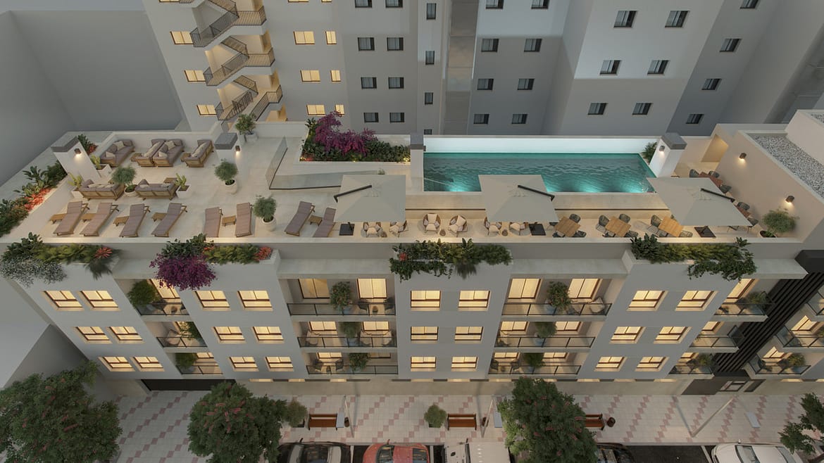 The building includes 64 automatic parking spaces, storages, lift and social areas on the rooftop for the owners. The rooftop garden and rooftop swimming pool are exclusively for the residents.