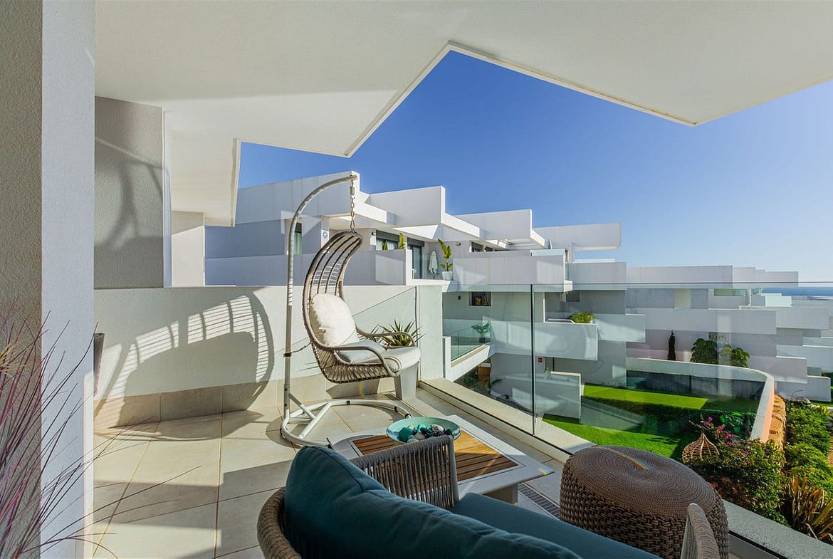 Pure South Residences, a private hillside development in Manilva, offers panoramic Mediterranean views and spacious communal areas designed for outdoor living, relaxation, and well-being. The modern architecture features clean white volumes, stepped terraces, and expansive glazing, connecting seamlessly with the natural surroundings.