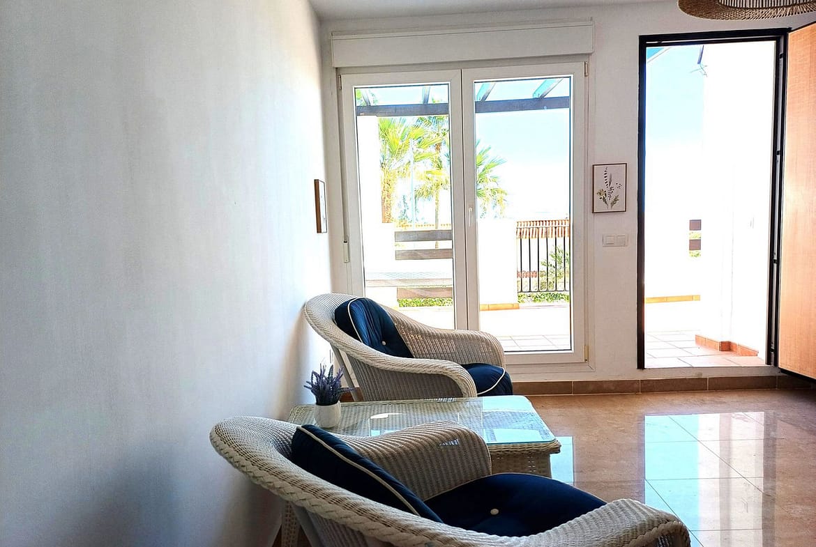 This beautiful two-bedroom, two-bathroom, raised ground-floor apartment is located in a residential area of Andalusian-style townhouses. The property was completely renovated in 2025 and comes fully furnished. The terrace and all windows offer beautiful sea views.