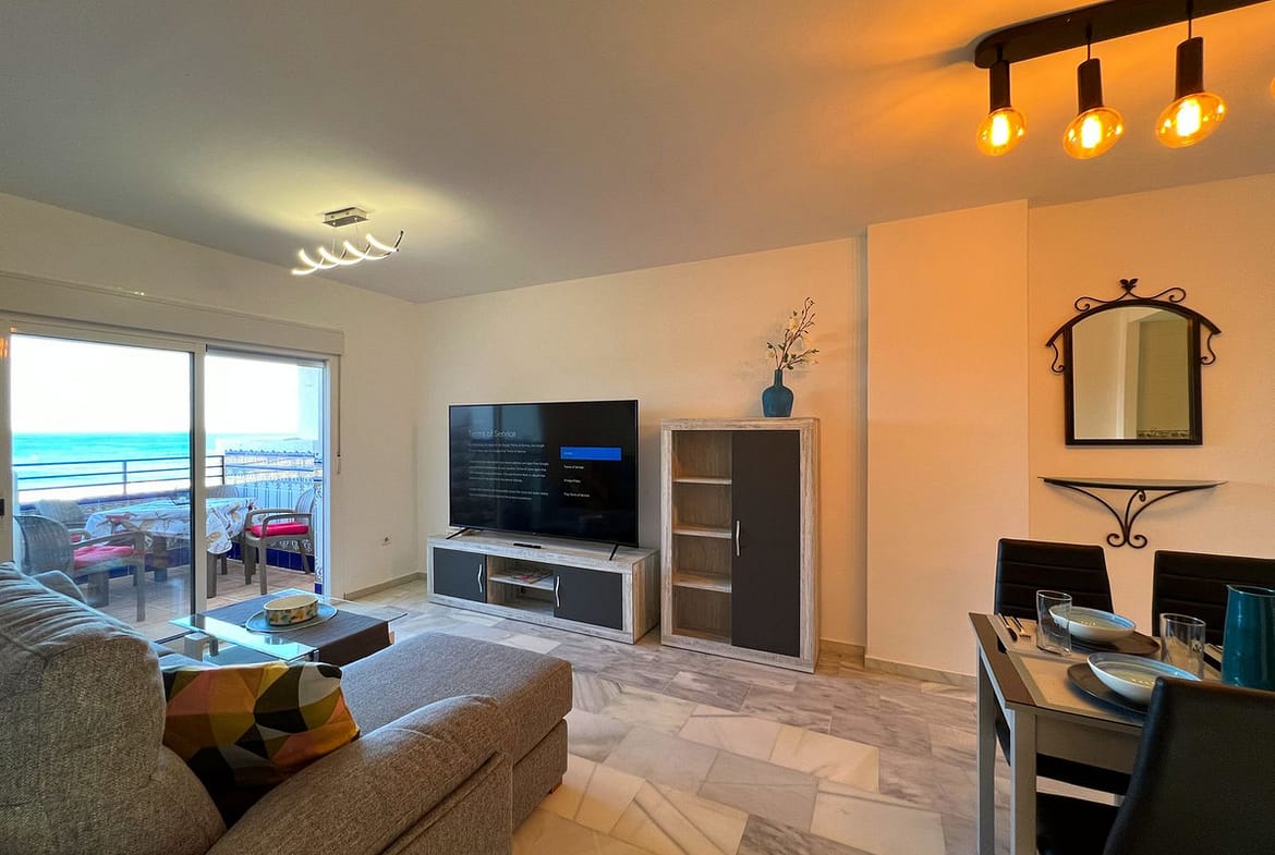 Enjoy the 75 inch smart TV for your entertainment. The master bedroom has a large double bed, from where you can enjoy an amazing sea view. The 2nd bedroom has 2 sinlge beds. A/C is throughout the apartment, in both bedrooms and in the open living/ dining area. The bathroom has a walk-in shower.