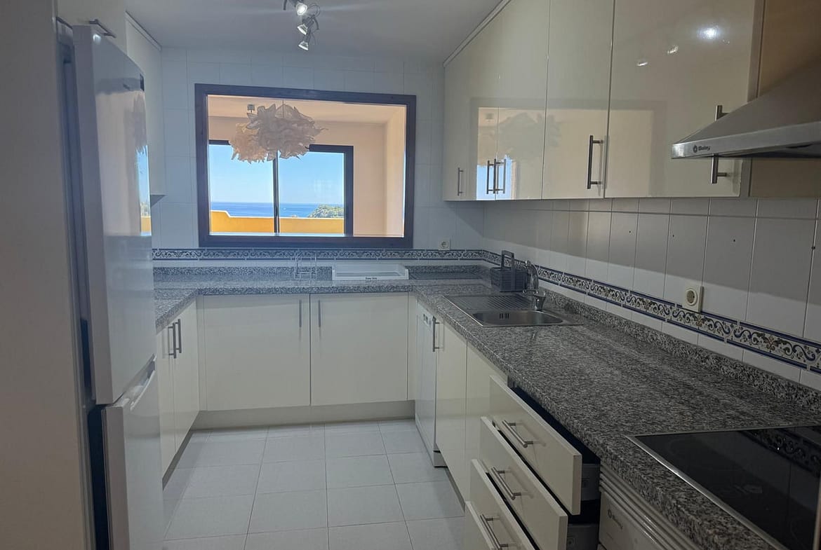 Nice and pleasant flat with sea views, 2 bedrooms and 2 bathrooms of which 1 en suite. The bathrooms have been refurbished and both have large showers. The master bedroom has access to the terrace with beautiful sea views which communicates with the living room. The terrace has a raised wooden floor that allows you to continue enjoying the views while having a nice dinner. The living-dining room is bright and pleasant and the kitchen is spacious with a serving hatch, which allows you to see the sea while cooking, nothing more pleasant.