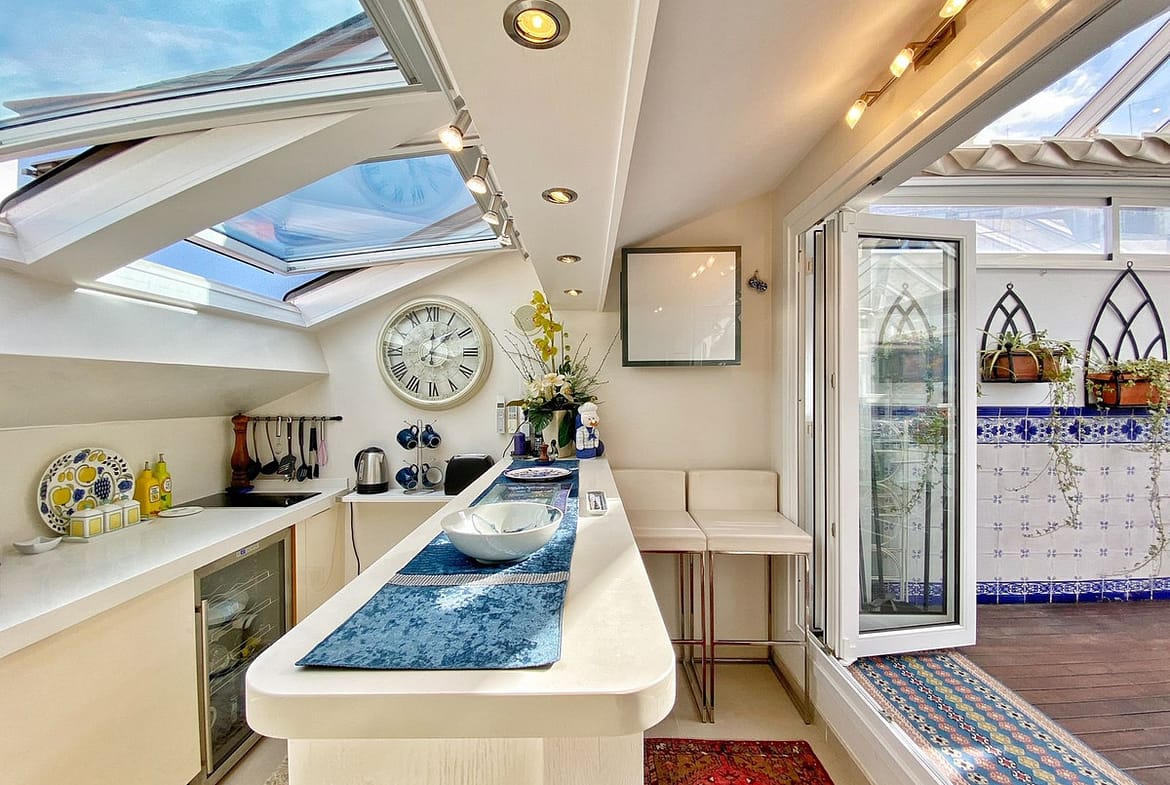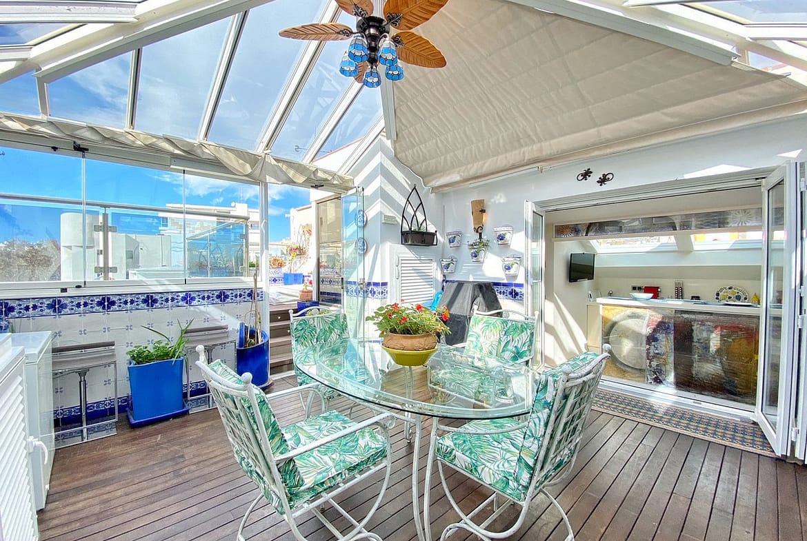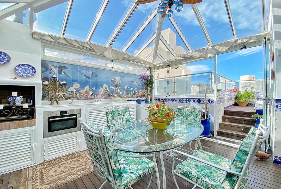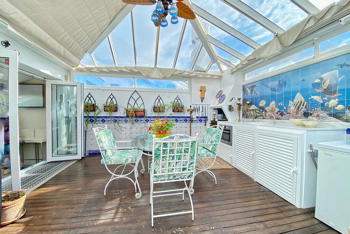 A fantastic terrace is covered by a dome with a glass roof, allowing for year-round use.