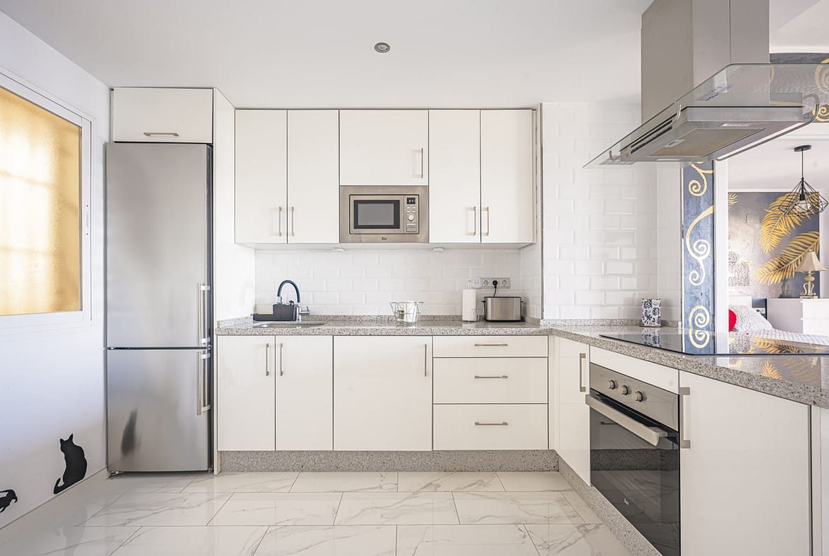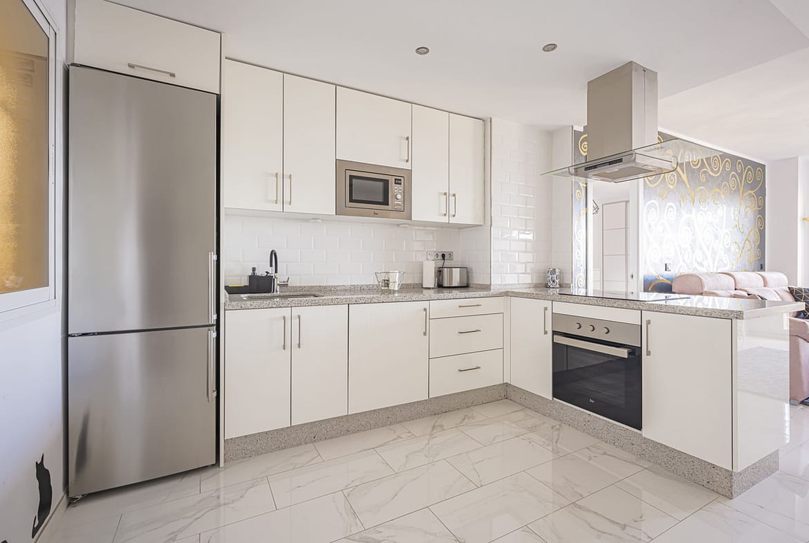 The kitchen is fully equipped with state of the art appliances including an oven, microwave, dishwasher, ceramic hob, fridge, and washing machine, all finished to a high standard. The apartment also features air conditioning, high speed internet, and comprises two double bedrooms and two full bathrooms, both with a modern and functional design.