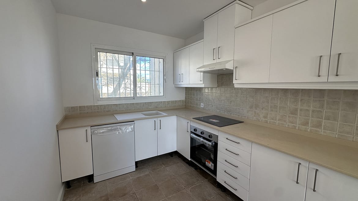 The apartment itself is finished to an excellent standard, with marble floors throughout, double-glazing for insulation, underfloor heating in the bathrooms, and integrated air conditioning for year-round comfort. The living room opens onto a private covered terrace, offering both sea and panoramic views, while glass doors allow natural light to flood the interior. The kitchen comes fully fitted and equipped, complemented by additional features such as fitted wardrobes, a storage room, and the option for bespoke furniture packages, providing flexibility for prospective owners.