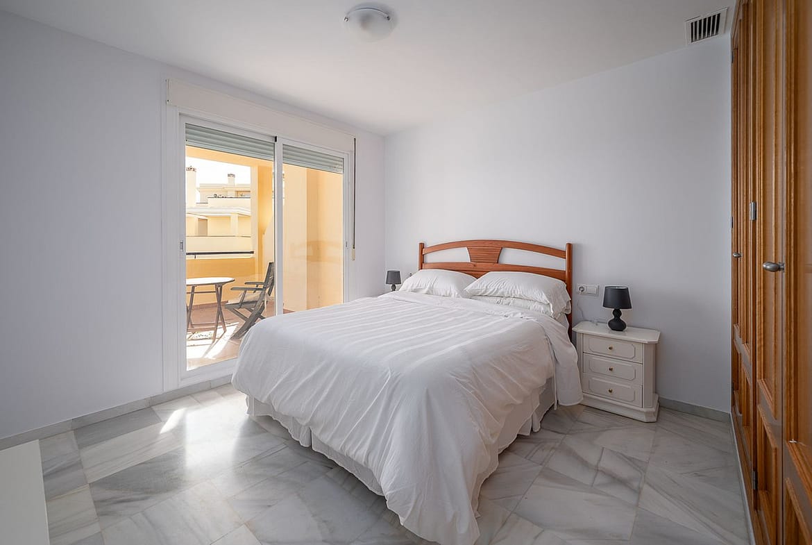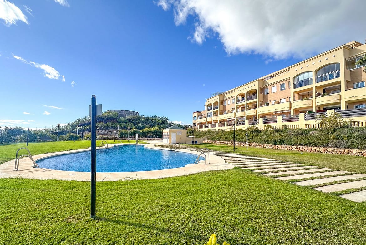 This spacious and very bright apartment is located in the upper part of El Chaparral in a gated community with a video entry system, with views of the racetrack and the sea. In a quiet area yet just minutes from Fuengirola and Cala de Mijas, this apartment is sold fully furnished and offers spacious rooms, including a separate kitchen with utility room, a living-dining room with access to the terrace, two double bedrooms, two full bathrooms, one ensuite, a terrace with views, and a parking space and storage room included. The community also has guest parking, a swimming pool, sauna, gym and gardens. Don't miss this opportunity!
