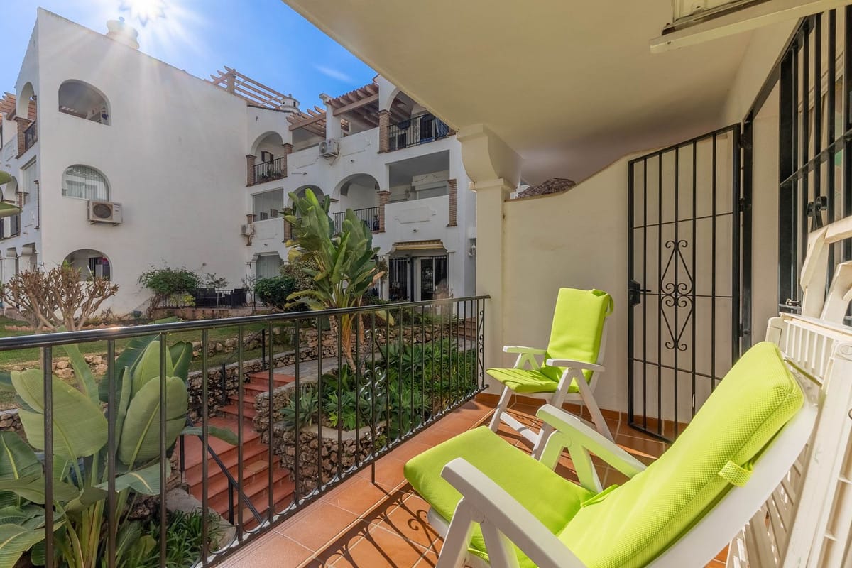 Situated in a highly convenient and sought-after location, this bright and beautifully presented ground floor garden apartment is within walking distance of a wide range of amenities and enjoys lovely views over the Mijas Golf course. The property offers two spacious bedrooms and two bathrooms, including a master suite with en-suite bathroom featuring both a bathtub and walk-in shower. The second bathroom is fitted with a shower. The master bedroom has a double bed, while the second bedroom offers twin beds. Both bedrooms are east-facing, allowing plenty of morning sunshine and direct access to a connecting terrace—perfect for enjoying your morning coffee.