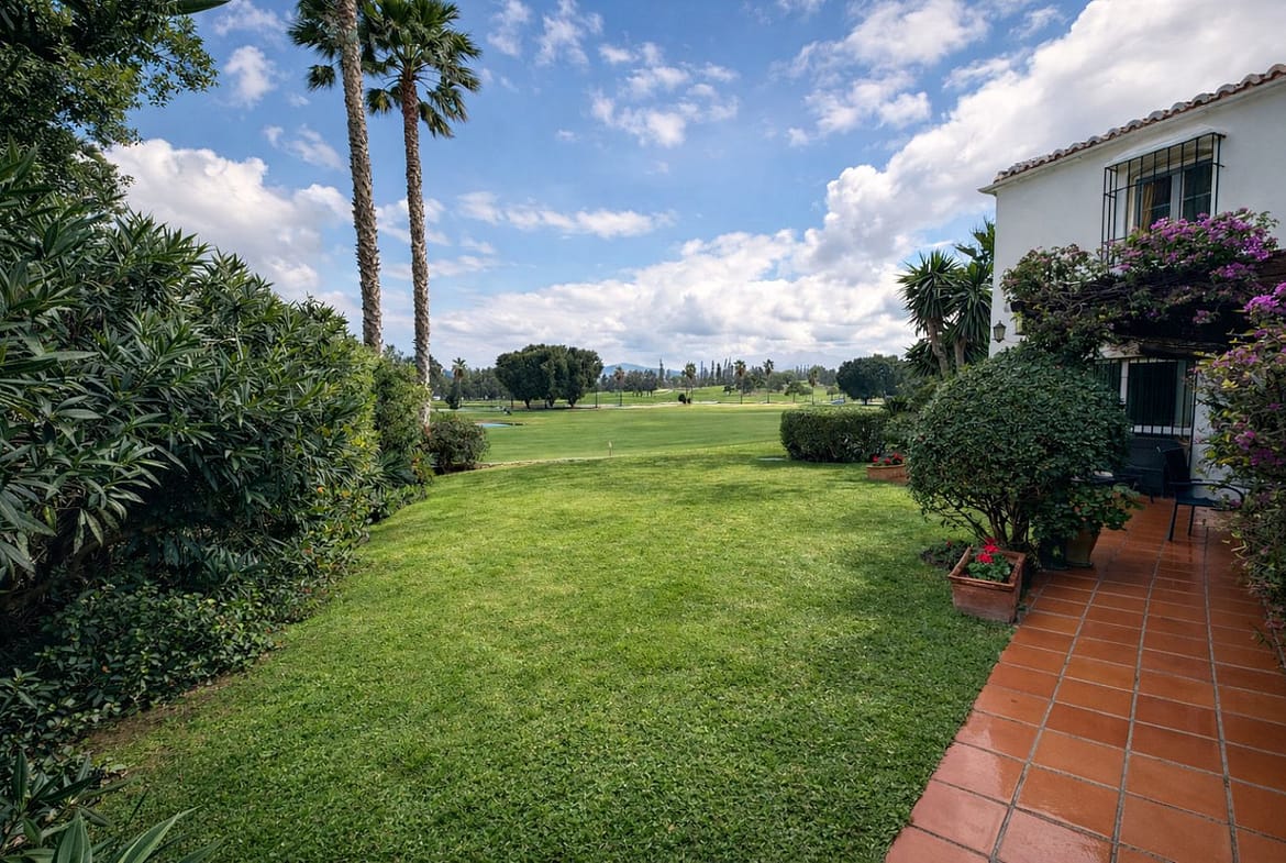 Sold fully furnished. With absolutely stunning views this apartment is situated right on the first line of Mijas Golf and faces west for the lovely afternoon and evening sun with wonderful sunsets. The gated complex of only 7 properties enjoys a large communal swimming pool and superb green areas. The property consists of a lovely split level lounge diner, 2 large bedrooms and 2 bathrooms, a fully fitted kitchen but best of all a lovely covered terrace with direct access onto the communal gardens. This property also includes a large underground parking space. Simply a fantastic investment as a permanent residence or holiday home.