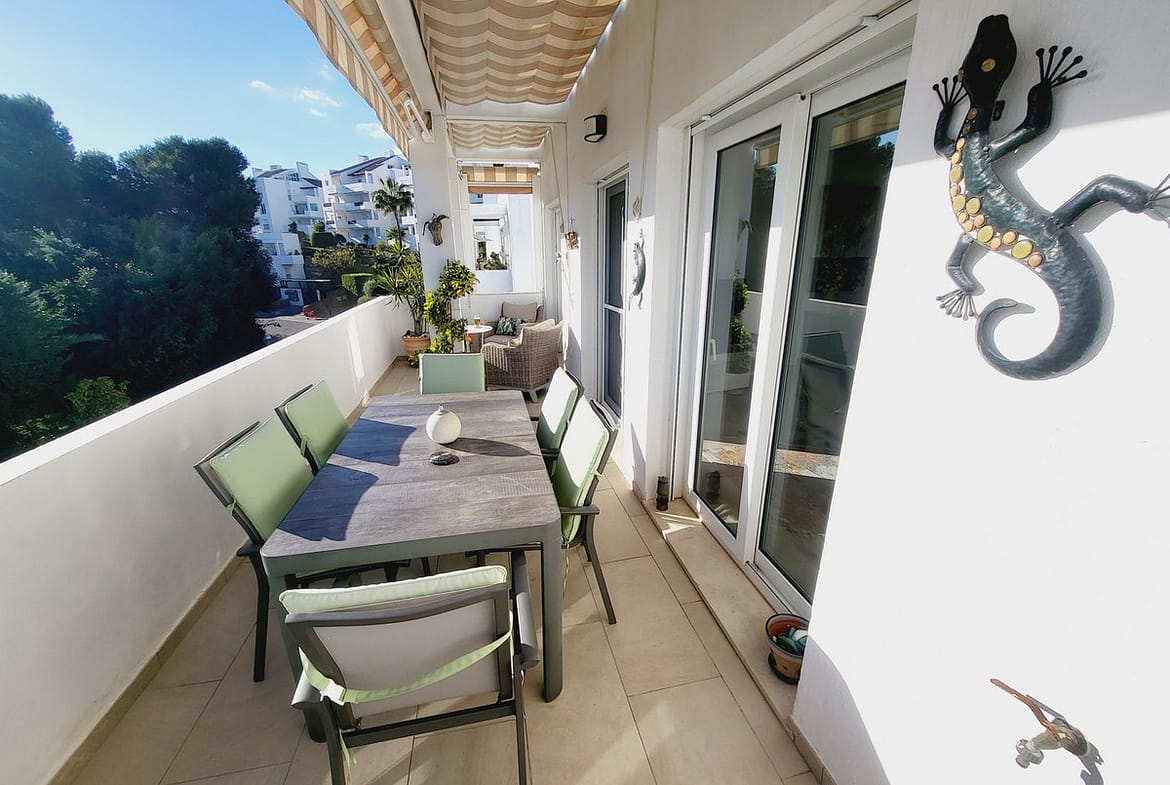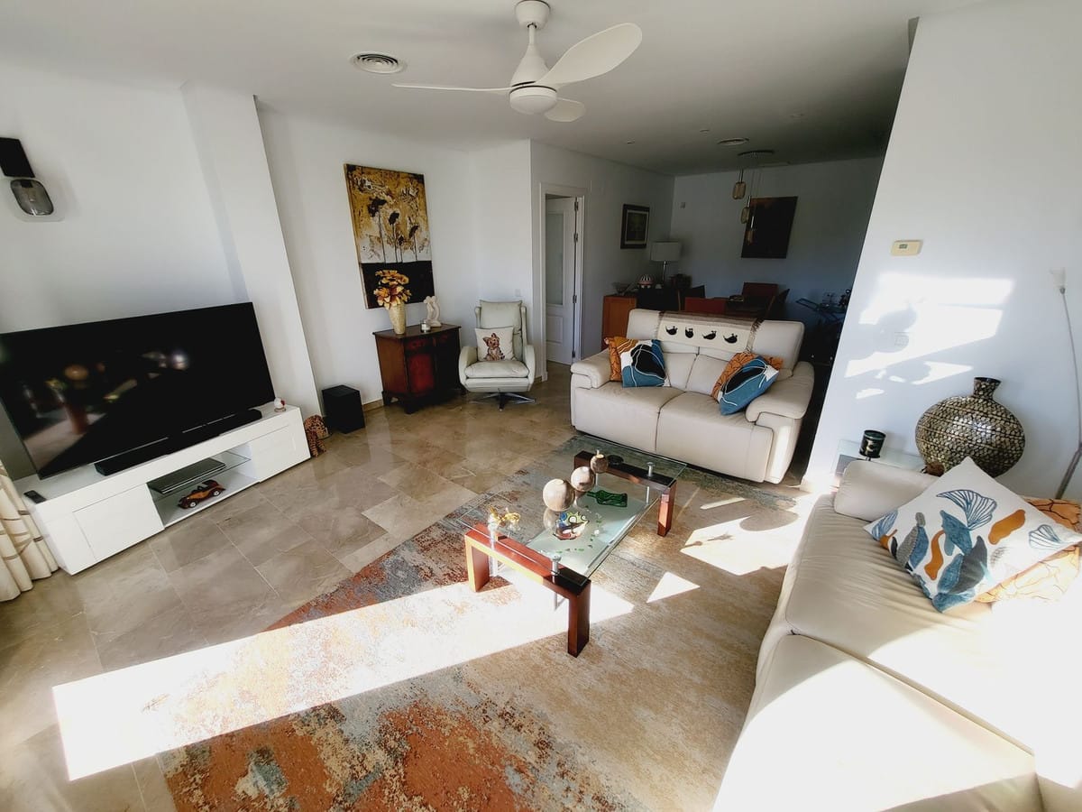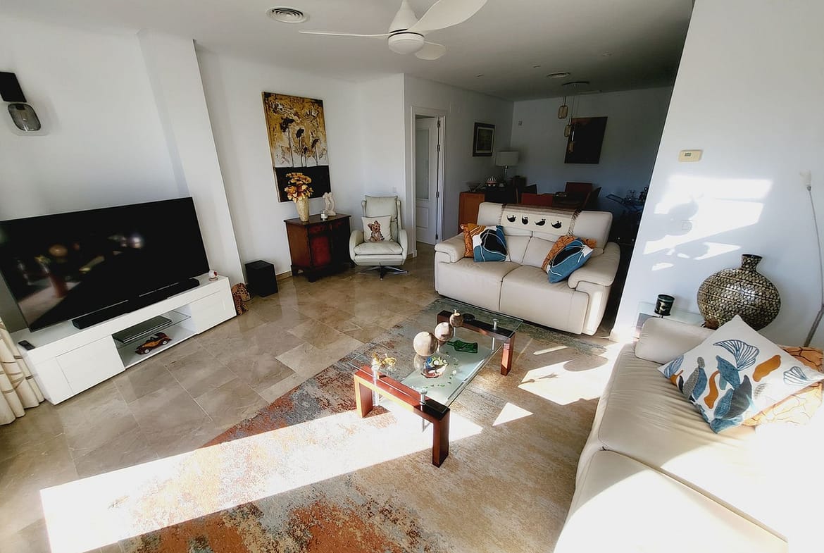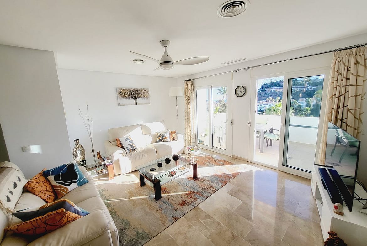 SUPERB HIGH QUALITY AND EXTREMELY SPACIOUS TWO BEDROOM TOP FLOOR APARTMENT LOCATED IN A MUCH SOUGHT-AFTER COMMUNITY IN MIRAFLORES THAT DIRECTLY OVERLOOKS MIRAFLORES GOLF COURSE. THE PROPERTY BOASTS A LARGE OPRN SUNNY TERRACE WHICH ENJOYS OPEN VIEWS TO MIRAFLORES GOLF AND THE SEA BEYOND. THE APARTMENT ITSELF HAS BEEN FINISHED TO VERY HIGH STANDARDS THROUGHOUT AND HAS ALSO BEEN UPGRADED RECENTLY WITH A STUNNING LUXURY OPEN PLAN KITCHEN AND BATHTOOMS THAT BOTH FEATURE WALK-IN SHOWERS.