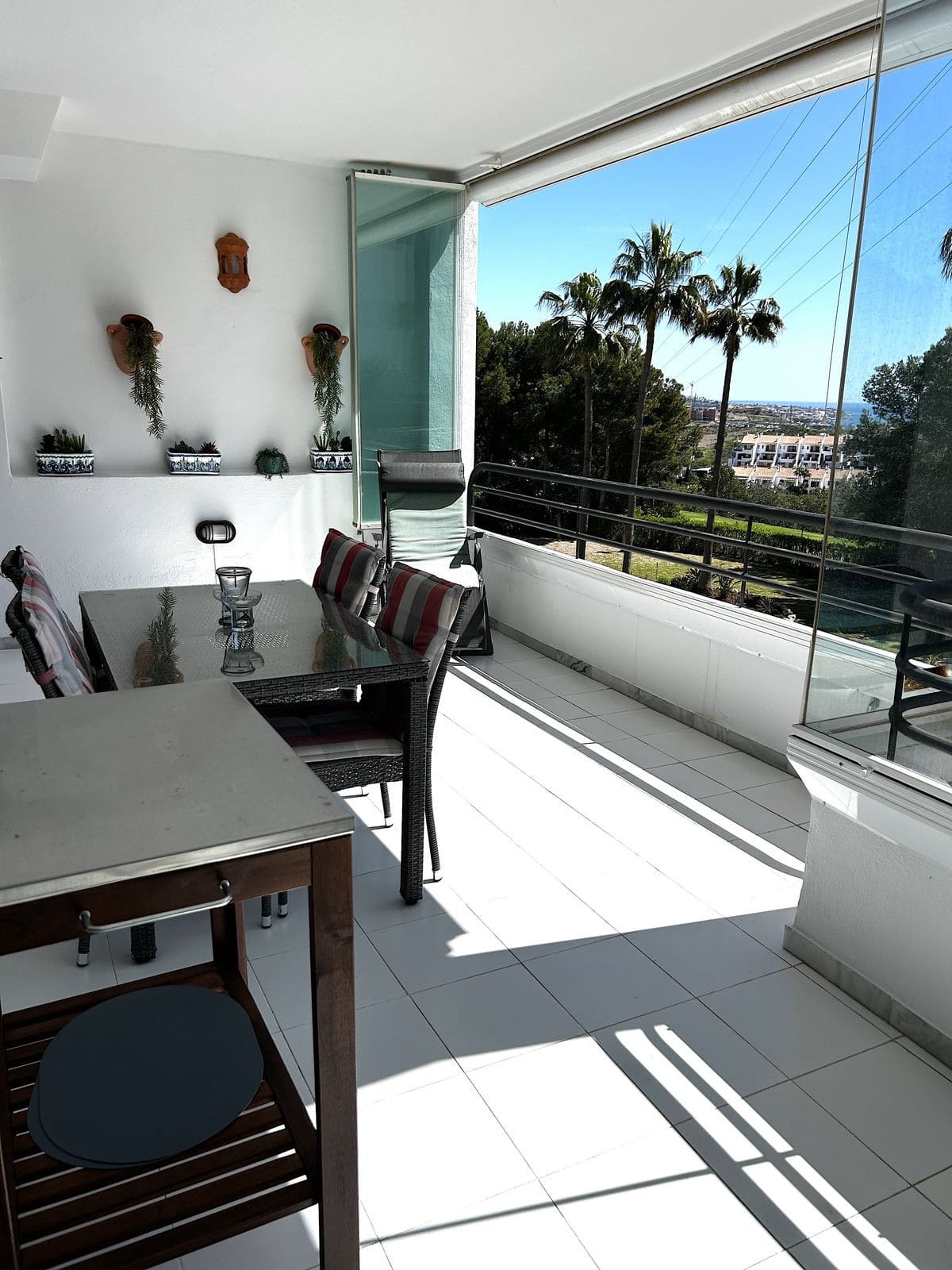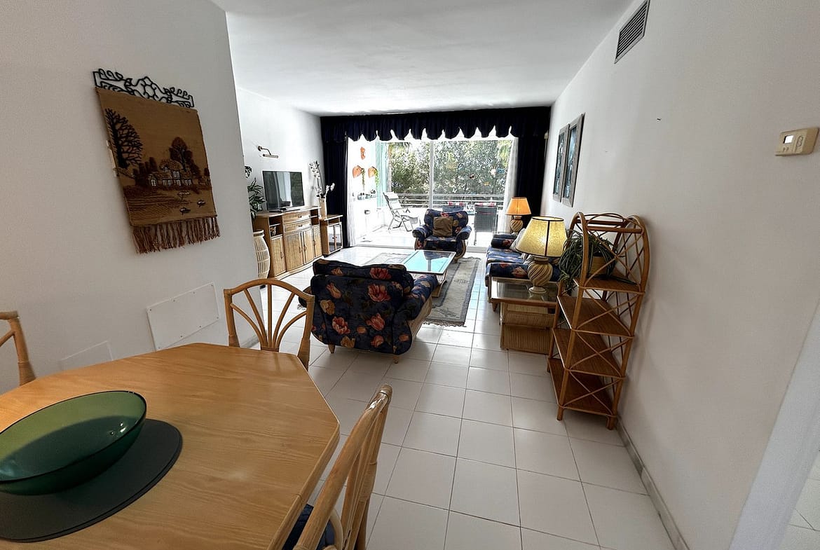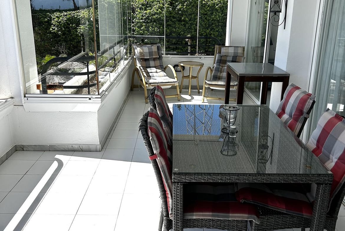 Entering the apartment, you are welcomed by a large lounge with dining area and direct access to the very spacious terrace with glass curtains, giving you use all year round.