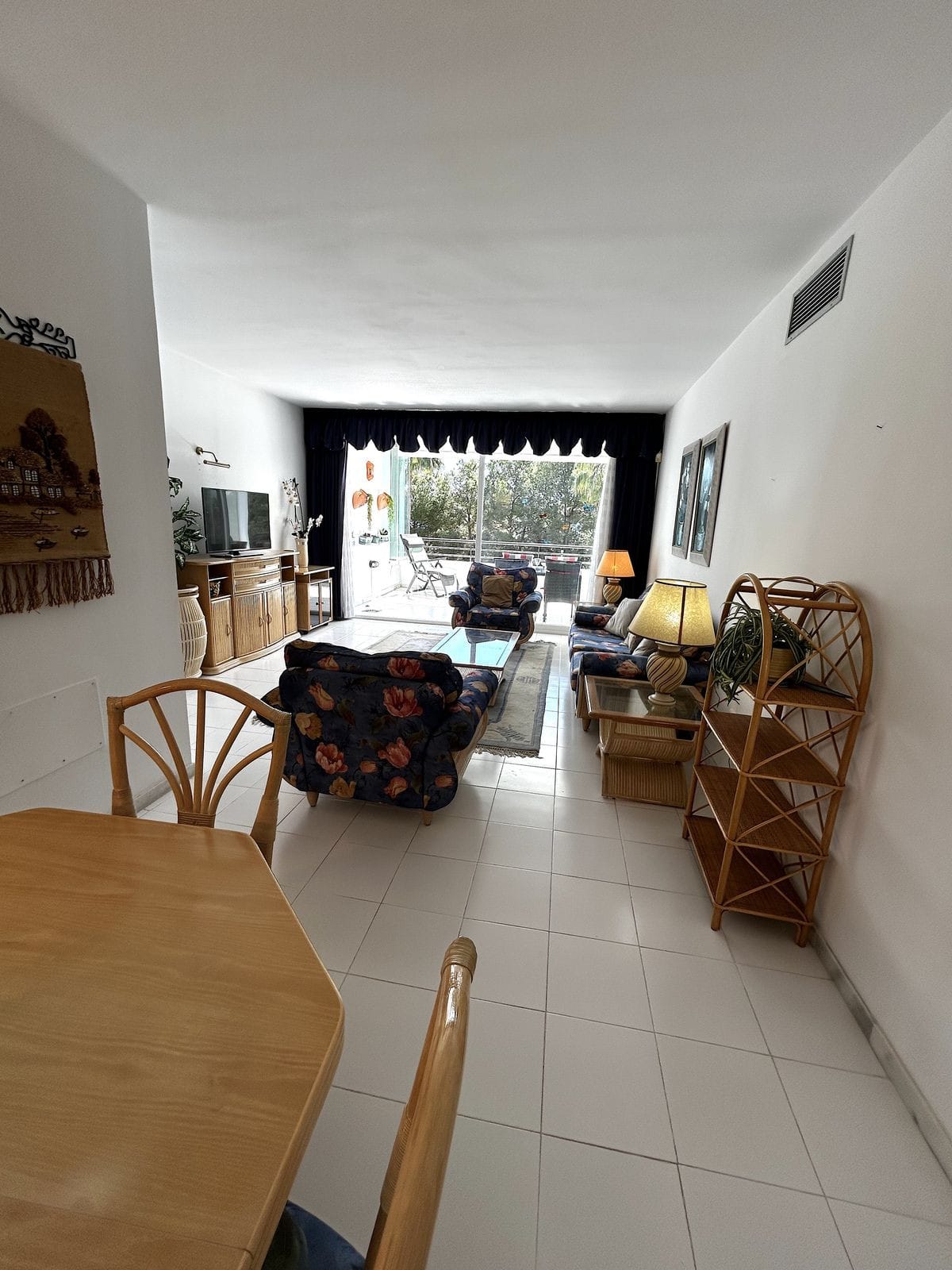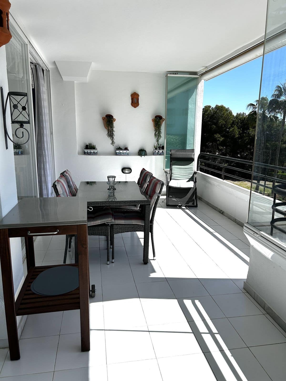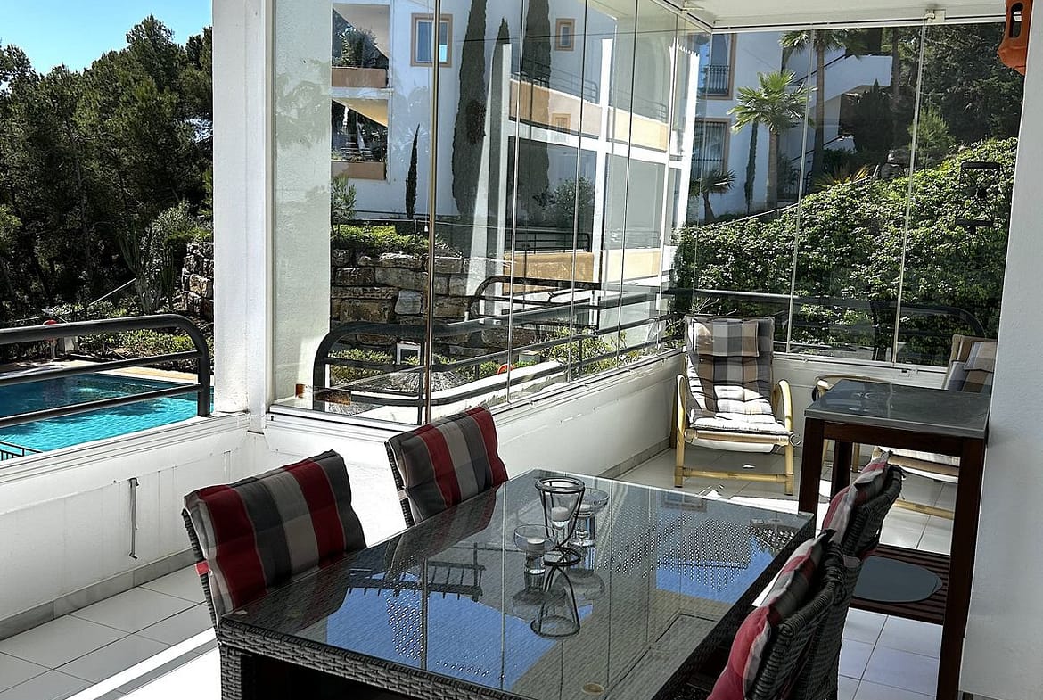 Entering the apartment, you are welcomed by a large lounge with dining area and direct access to the very spacious terrace with glass curtains, giving you use all year round.