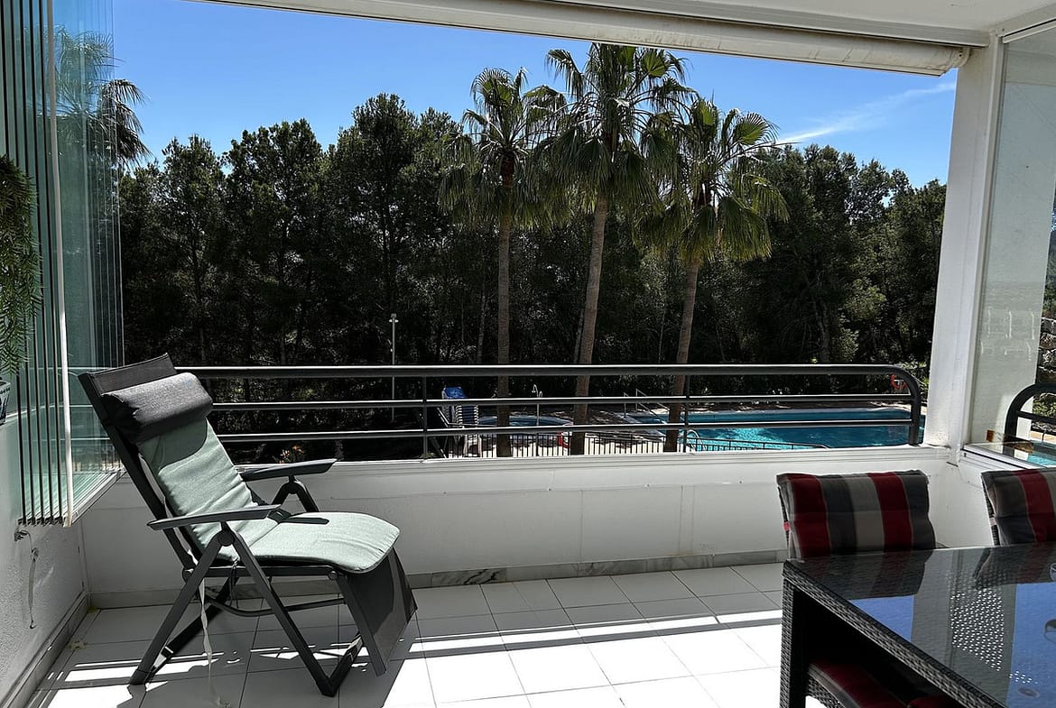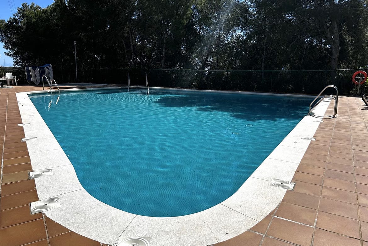 The apartment is located on the corner of the block next to the pool on the second floor without a lift.