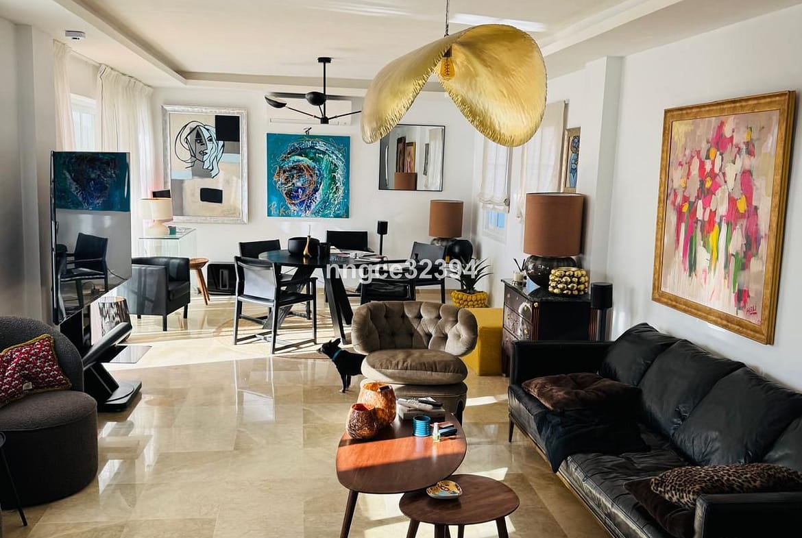 Discover coastal sophistication in this beautifully reimagined 2-bedroom, 2-bathroom penthouse on the New Golden Mile. Nestled within a quiet, gated, charming pueblo-style community in Benamara, this top-floor gem offers a rare blend of artistic design, modern comfort, and effortless beachside living. This penthouse is located just a few minutes’ walk to Salduna Beach and only 10 minutes by car to the glitz and glamour of Puerto Banús.