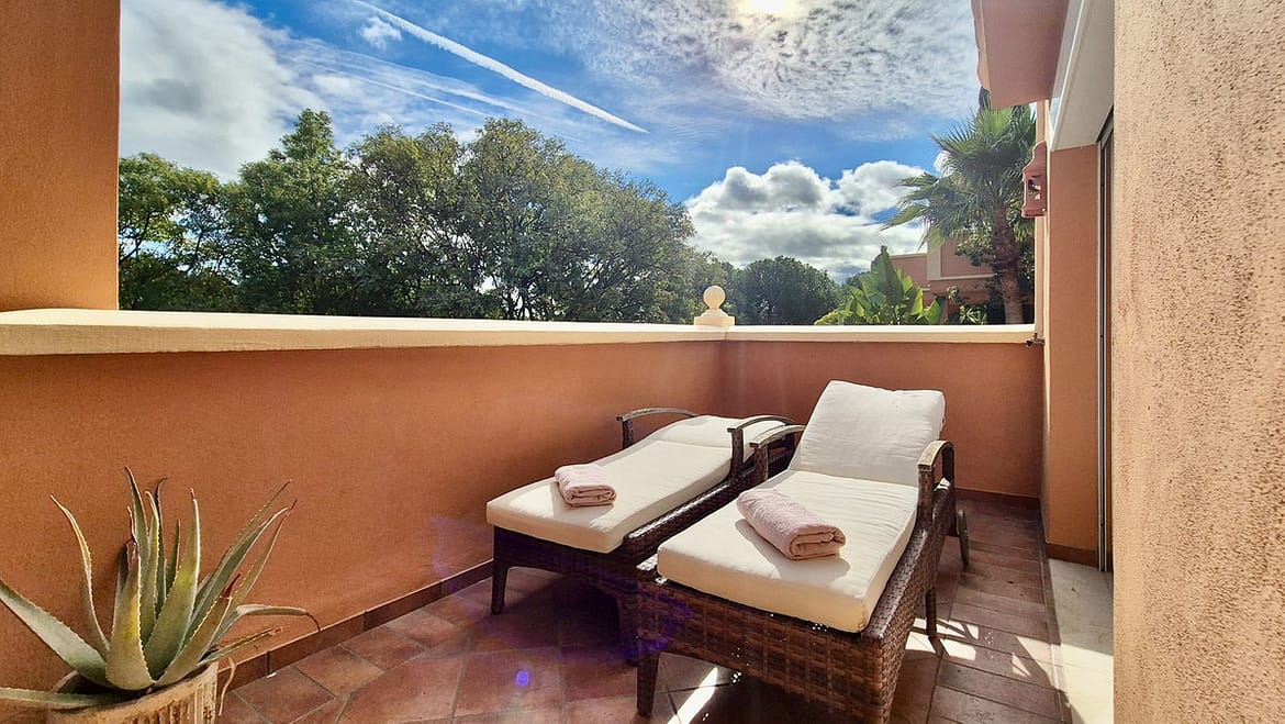 The main bedroom features an en-suite bathroom and direct access to the terrace, creating a peaceful retreat with plenty of natural light. The second bedroom is equally comfortable, supported by a well-appointed guest bathroom.