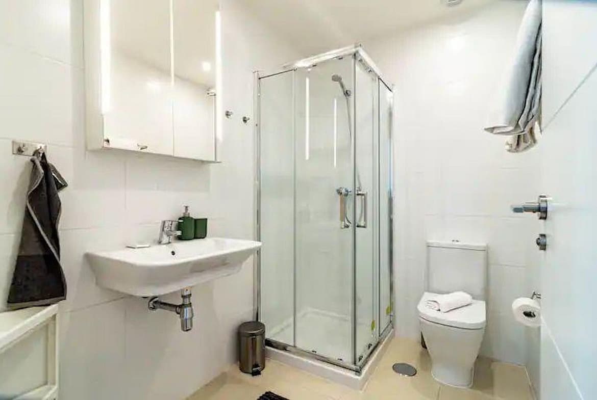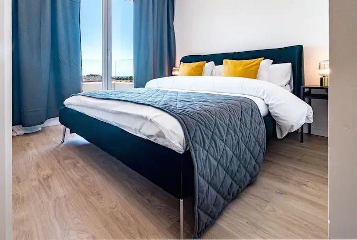 This elevated 5th floor unit boasts open sea views, with bright natural light per its position. The layout is modern and practical, divided between living and resting areas. The kitchen is open with all appliances. The living room is large, leading directly to a confortable sized terrace. Both bedrooms are of good size, with bathroom ensuite.