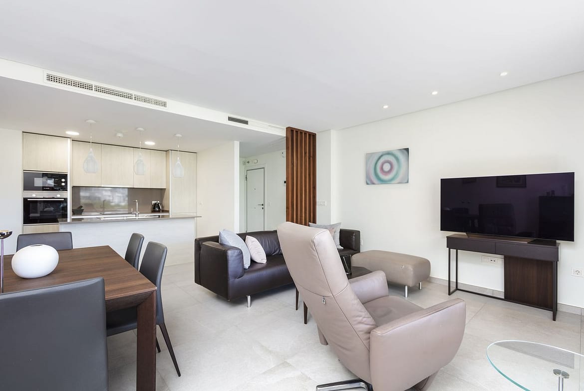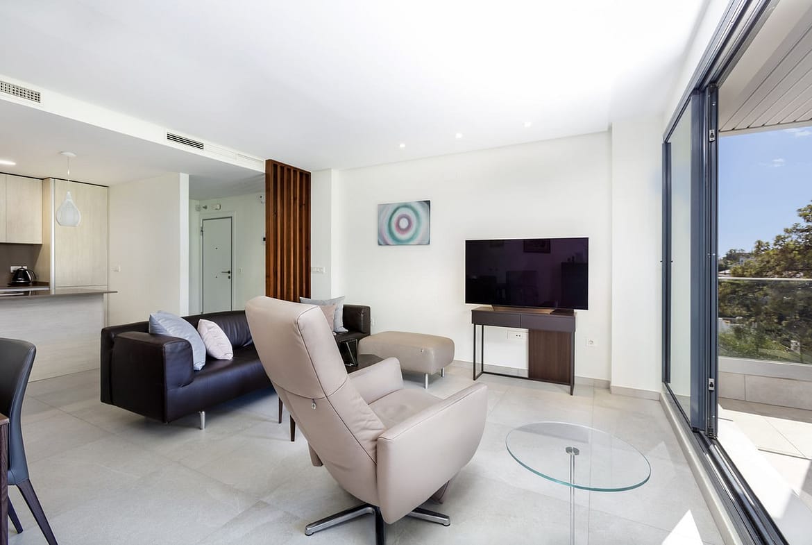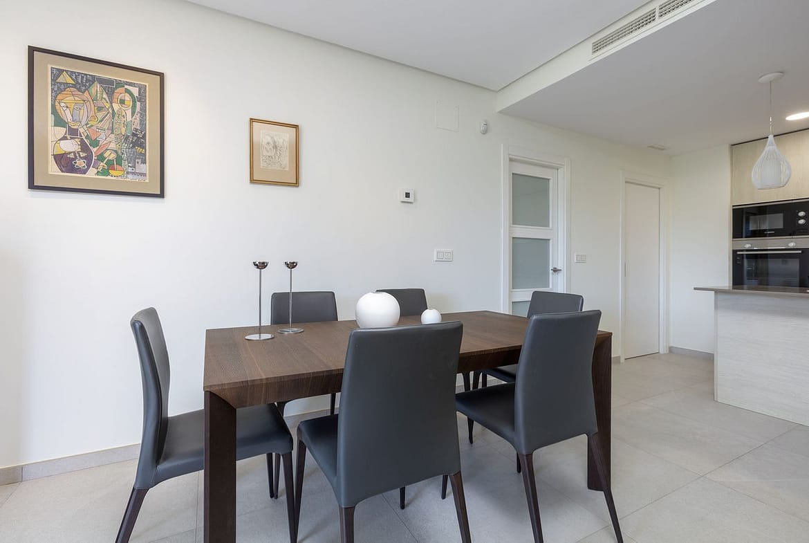 Upon entering, you are greeted by a spacious open-plan kitchen that seamlessly connects to the living area. The kitchen includes an island unit, providing additional countertop space as well as an adjacent utility room for further storage. The room is filled with natural light streaming through the double sliding glass doors, which open directly onto the apartment’s spacious private terrace. Here, you can enjoy the afternoon and evening sun while taking in the open views.