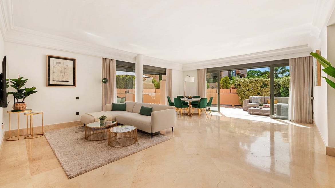 An exclusive 2-bedroom, 2-bathroom apartment, fully renovated and brand new, is presented in the prestigious Lorcrigolf development in Nueva Andalucía, Marbella. Located in a privileged setting on the edge of the Los Naranjos golf course, this property enjoys proximity to shops, restaurants, public transport, schools, children's play areas, Marbella port, and the beaches, ensuring an excellent quality of life and a wide range of leisure options.