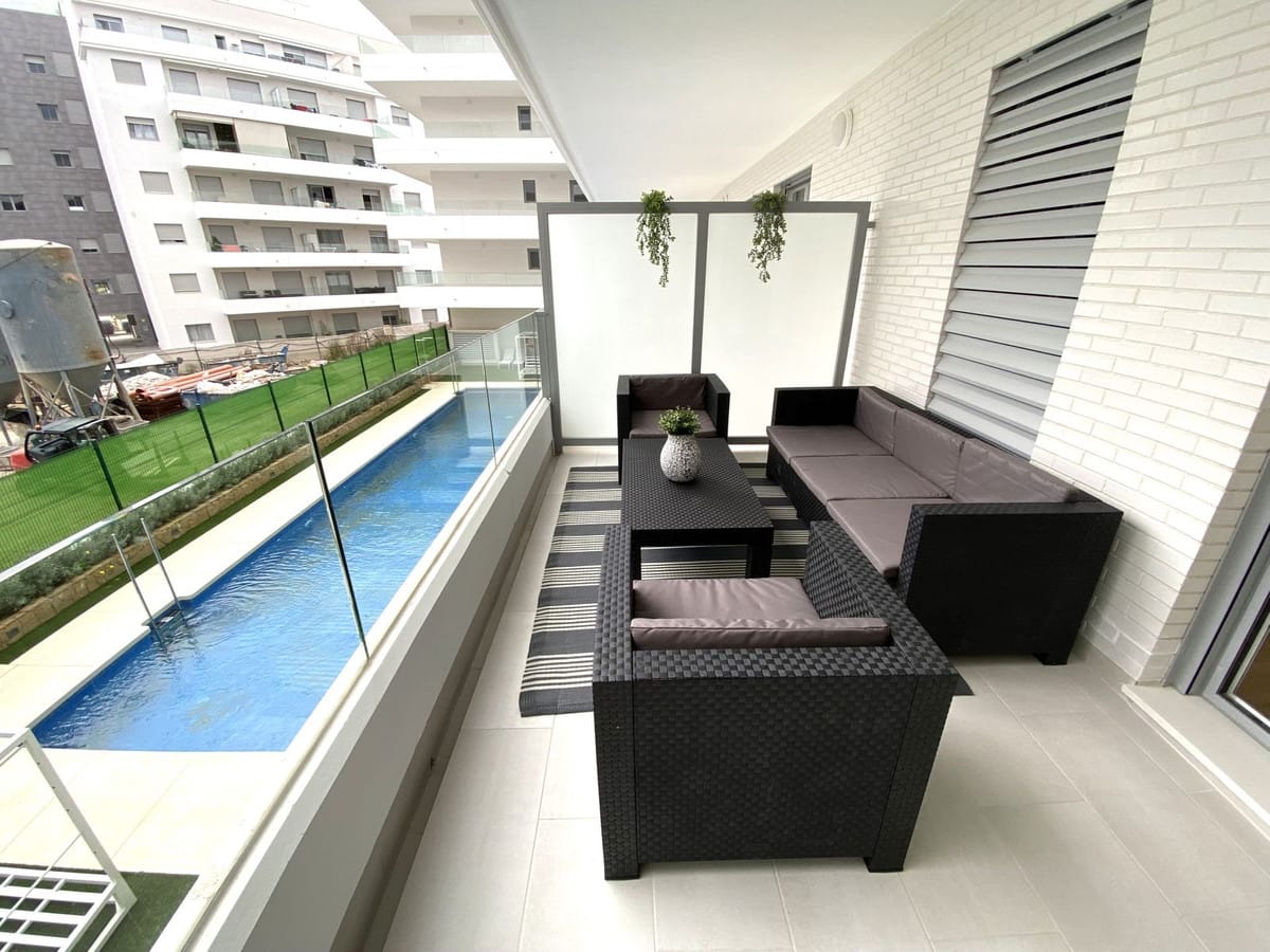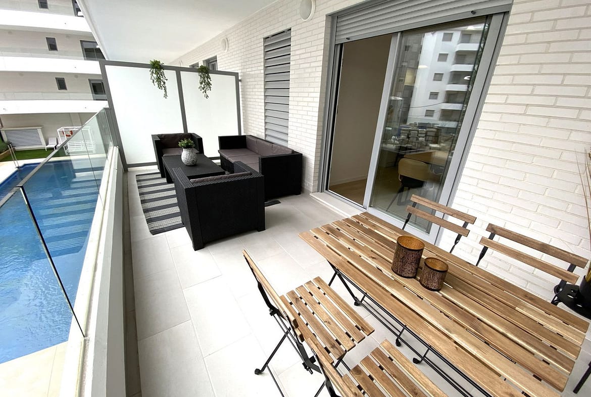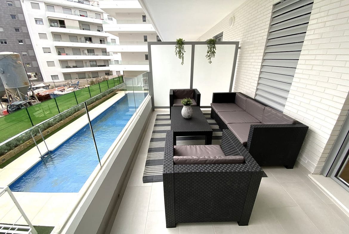 It consists of a living room with an open kitchen with direct access to the south-facing terrace with views of the pool.
