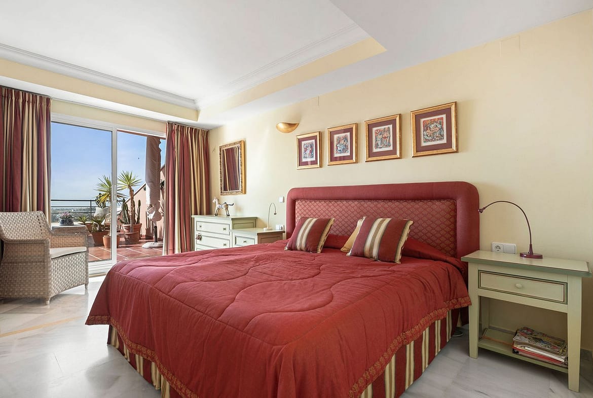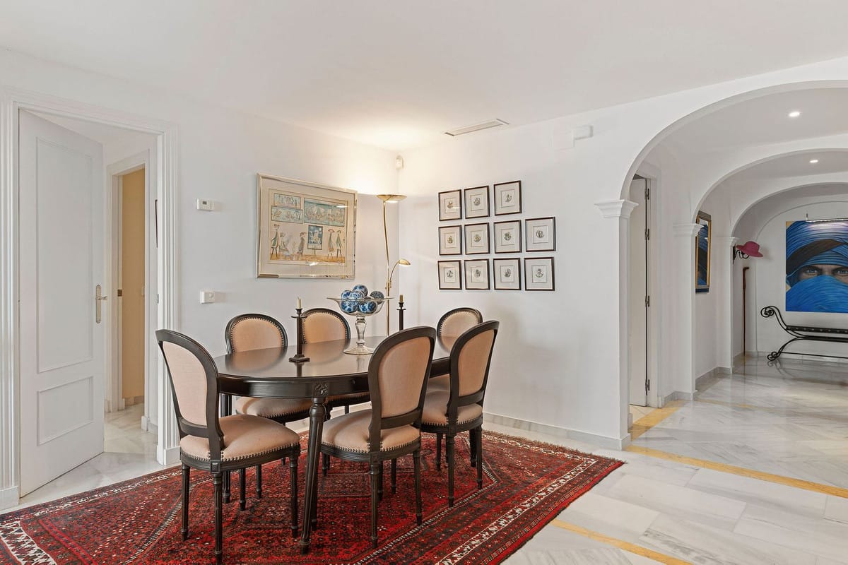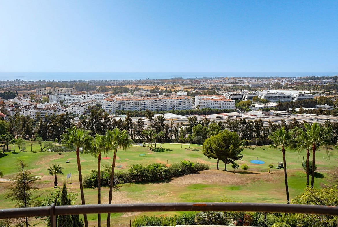 Introducing this spacious two-bedroom corner apartment located in the sought-after development of Magna Marbella in Nueva Andalucia offering stunning panoramic sea, mountain & golf views from it's west facing terrace. The accomodation comprises an entrance hall, fully equipped kitchen, spacious lounge & dining area leading directly out onto the covered/uncovered terrace, master bedroom suite with direct access to the terrace and a good-sized guest bedroom & family bathroom. This unit has the possibilty to be converted into a three-bedroom and an extra special feature is the large double terrace. The development itself is gated with 24-hour security, two communal pools and 1 underground parking space and storage room included in the price.