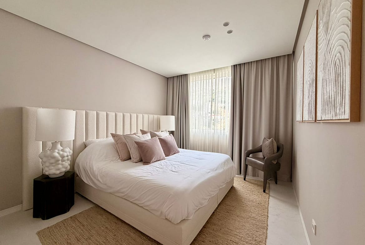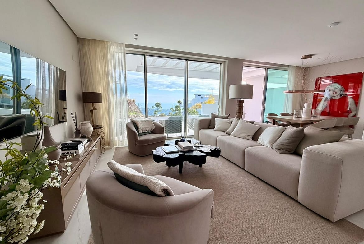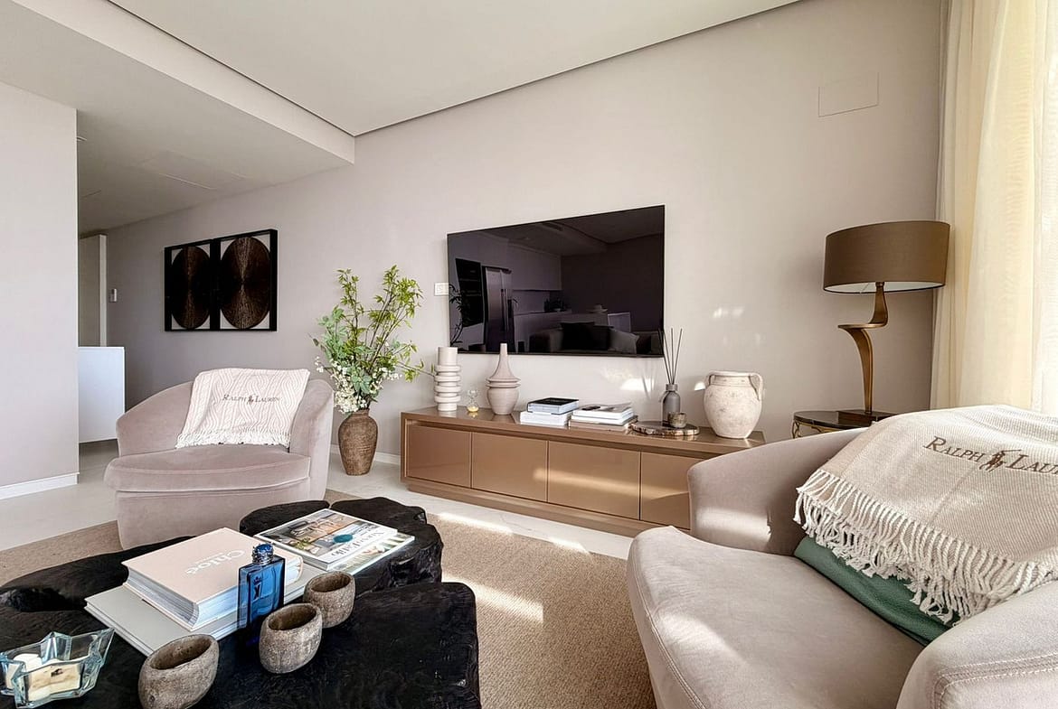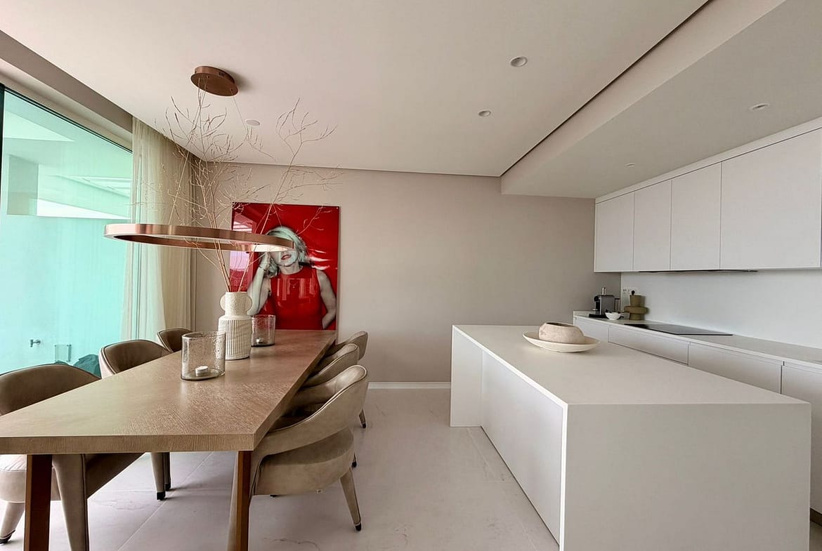 The master bedroom includes fitted wardrobes and an en-suite bathroom, while the second bedroom is ideal for guests or family. The interior combines high-quality Porcelanosa finishes with furniture and design by Minotti, creating a refined, elegant, and timeless living space.