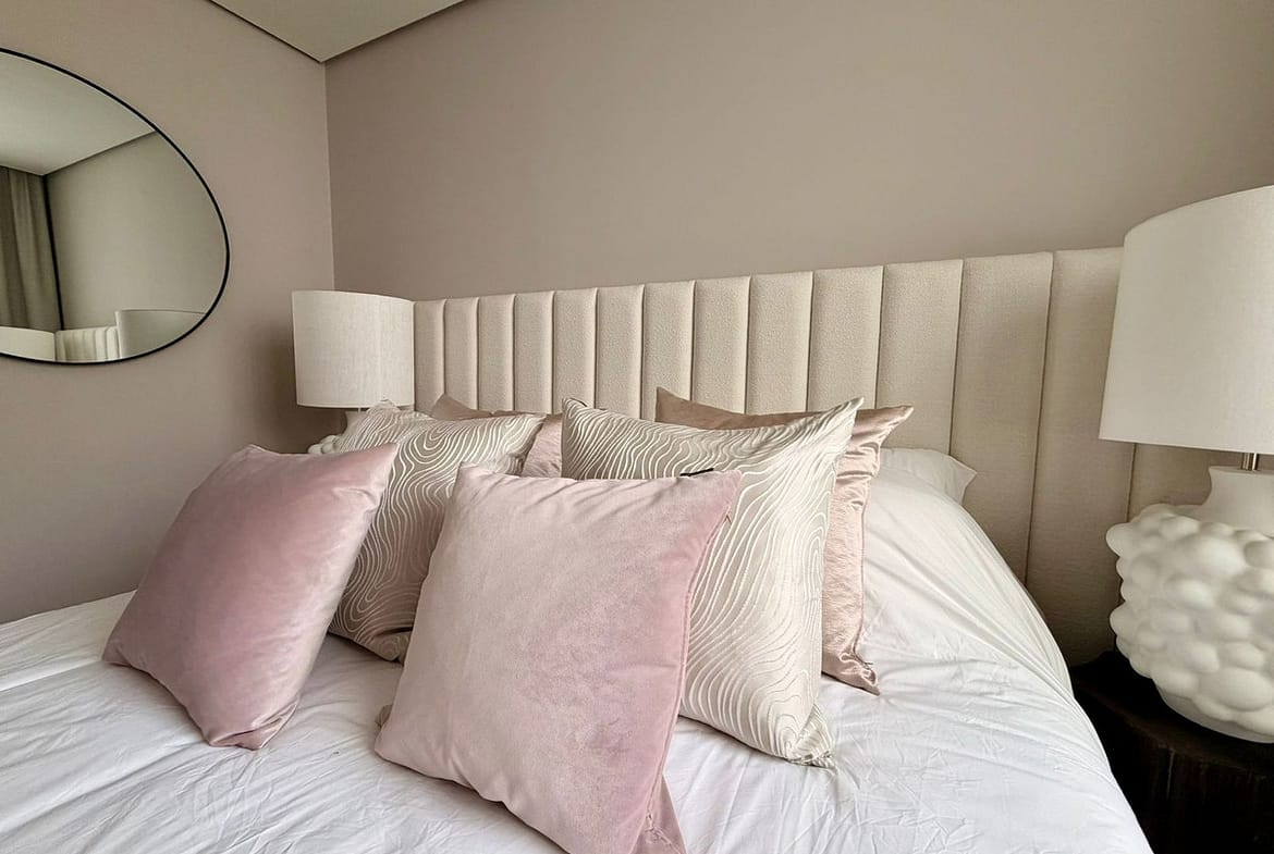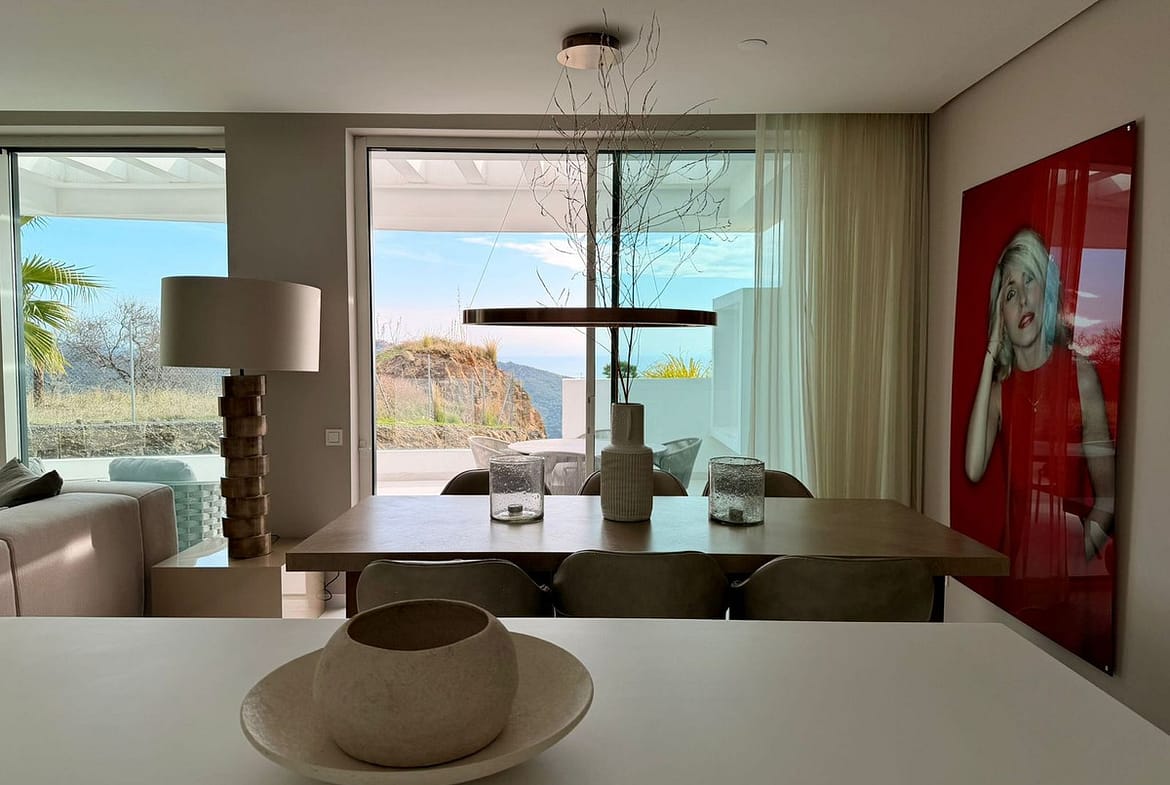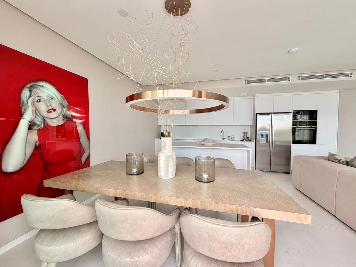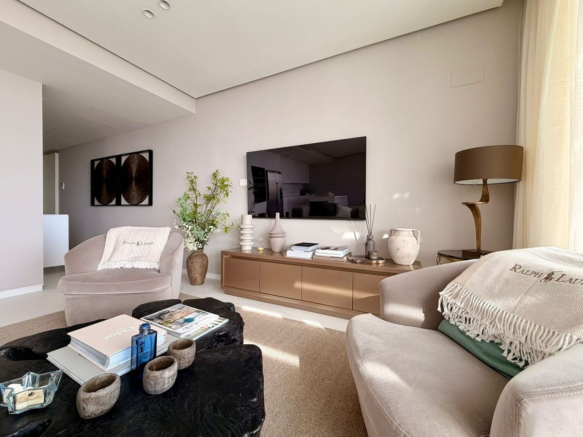 The master bedroom includes fitted wardrobes and an en-suite bathroom, while the second bedroom is ideal for guests or family. The interior combines high-quality Porcelanosa finishes with furniture and design by Minotti, creating a refined, elegant, and timeless living space.