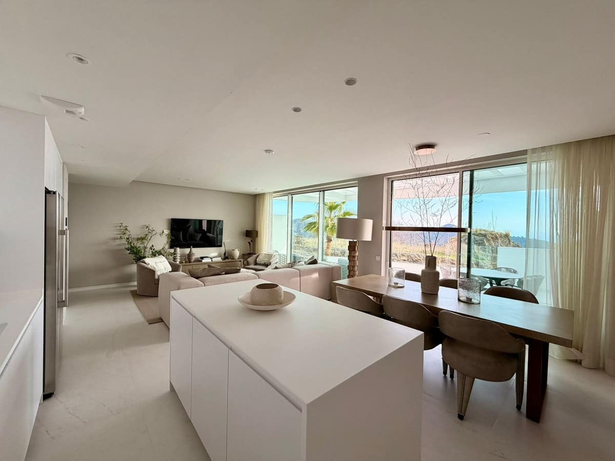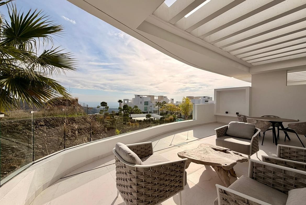 This elegant 2-bedroom first floor apartment for sale is located in the exclusive Granados development, set on the highest plot within the gated community of Palo Alto, Ojén, and enjoys beautiful panoramic sea views over Marbella and the Mediterranean.
