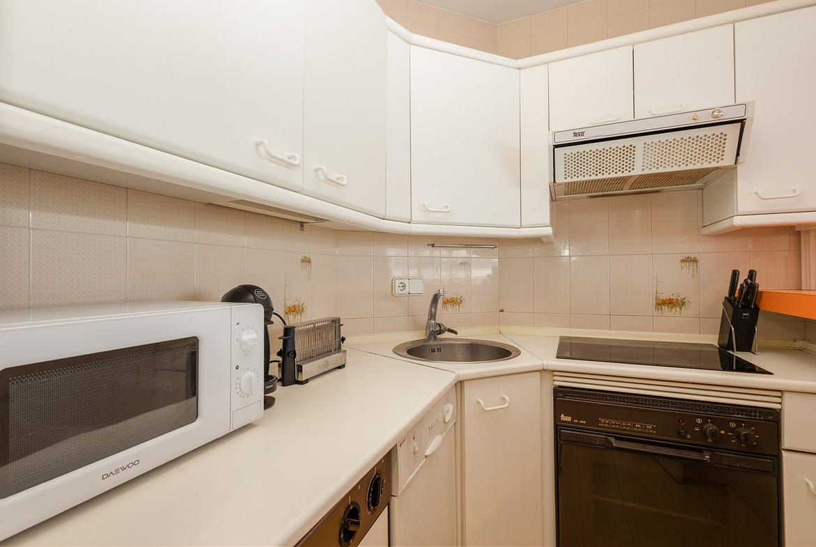 The American-style kitchen, integrated into the living area, is fully equipped with modern appliances: fridge, oven, microwave, ceramic hob, toaster, coffee maker, and more. Everything you need for a comfortable stay.