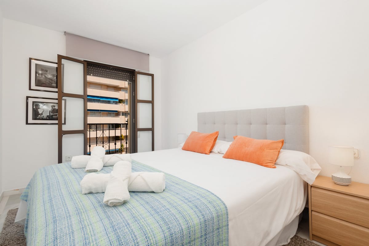 The two bedrooms are tastefully decorated and designed for comfort. The master bedroom features a double bed, natural light, and a private balcony. The second bedroom has two single beds and access to the main terrace. Additionally, the living room includes a sofa bed for added flexibility.