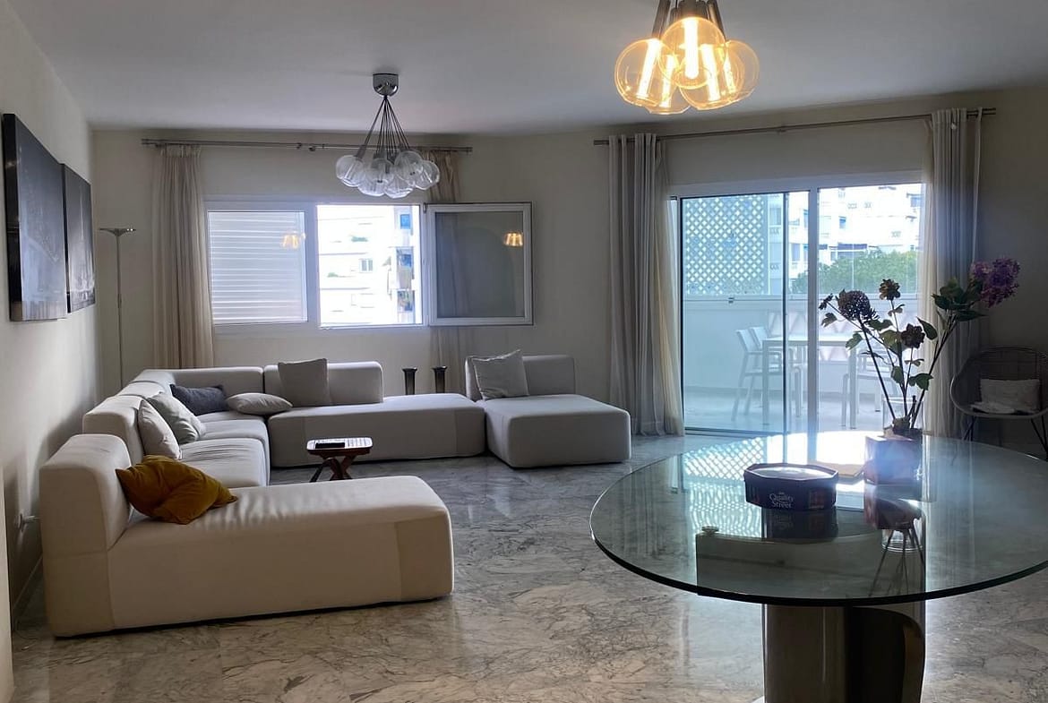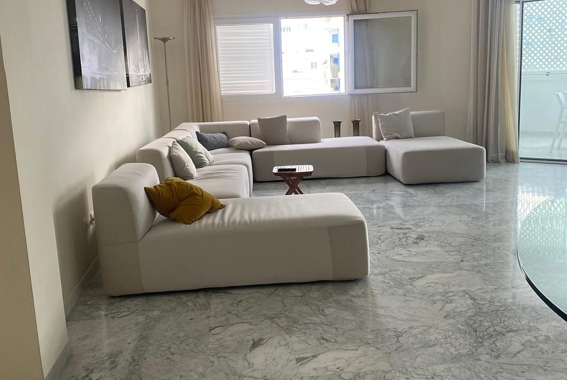 The apartment features a spacious and bright living area, tastefully decorated in soft neutral tones that enhance the sense of space and refinement.