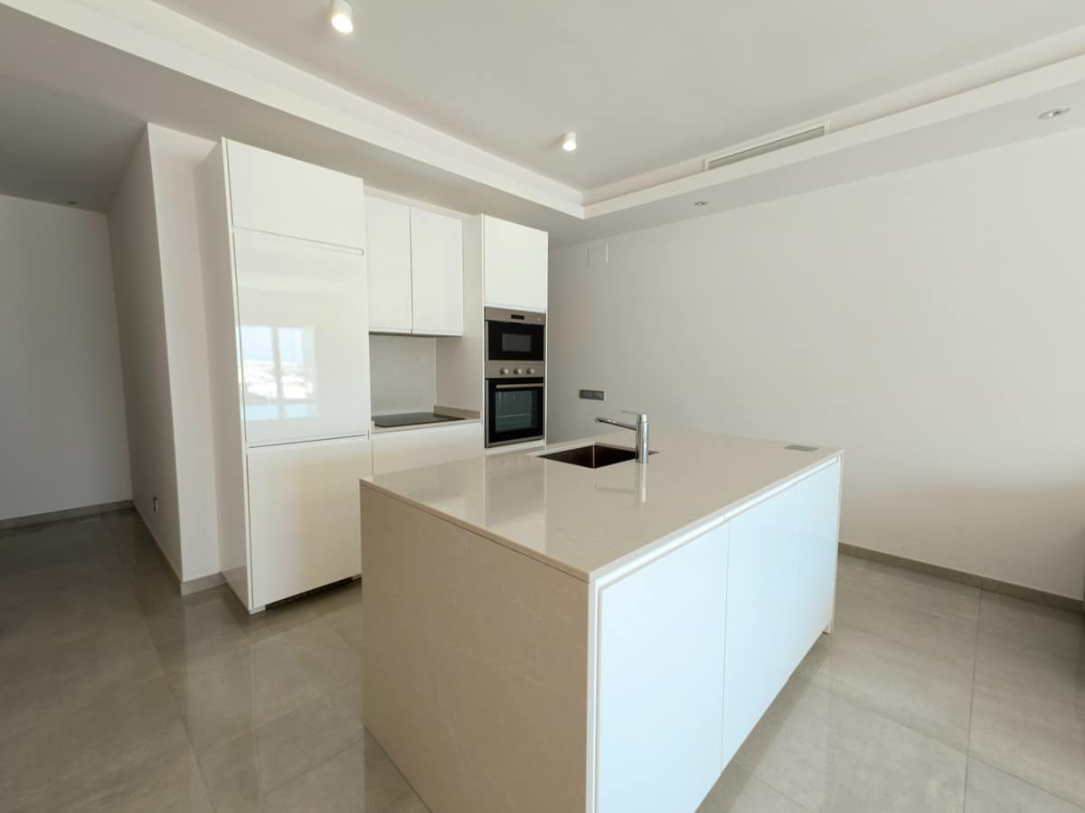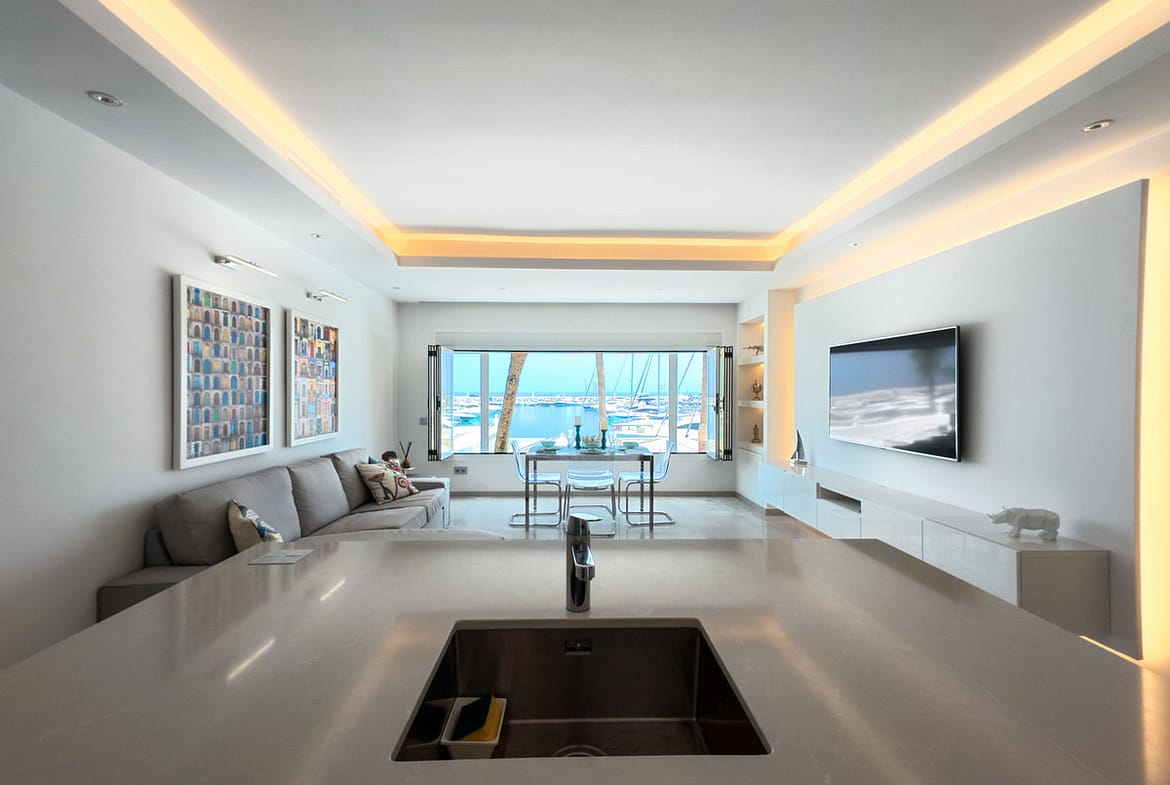 Designed to the highest standards, the apartment spans 81m² and showcases a modern, open plan layout, maximising space and bathing the interior in abundant natural light. The living area is enhanced by high-quality glass doors, panoramic views of both the marina and the sea, and a fully fitted kitchen ideal for seamless entertaining. The main bedroom boasts a private bathroom and captivating sea views, while the second bedroom has access to a full separate bathroom and there is an additional guest toilet for comfort and practicality.