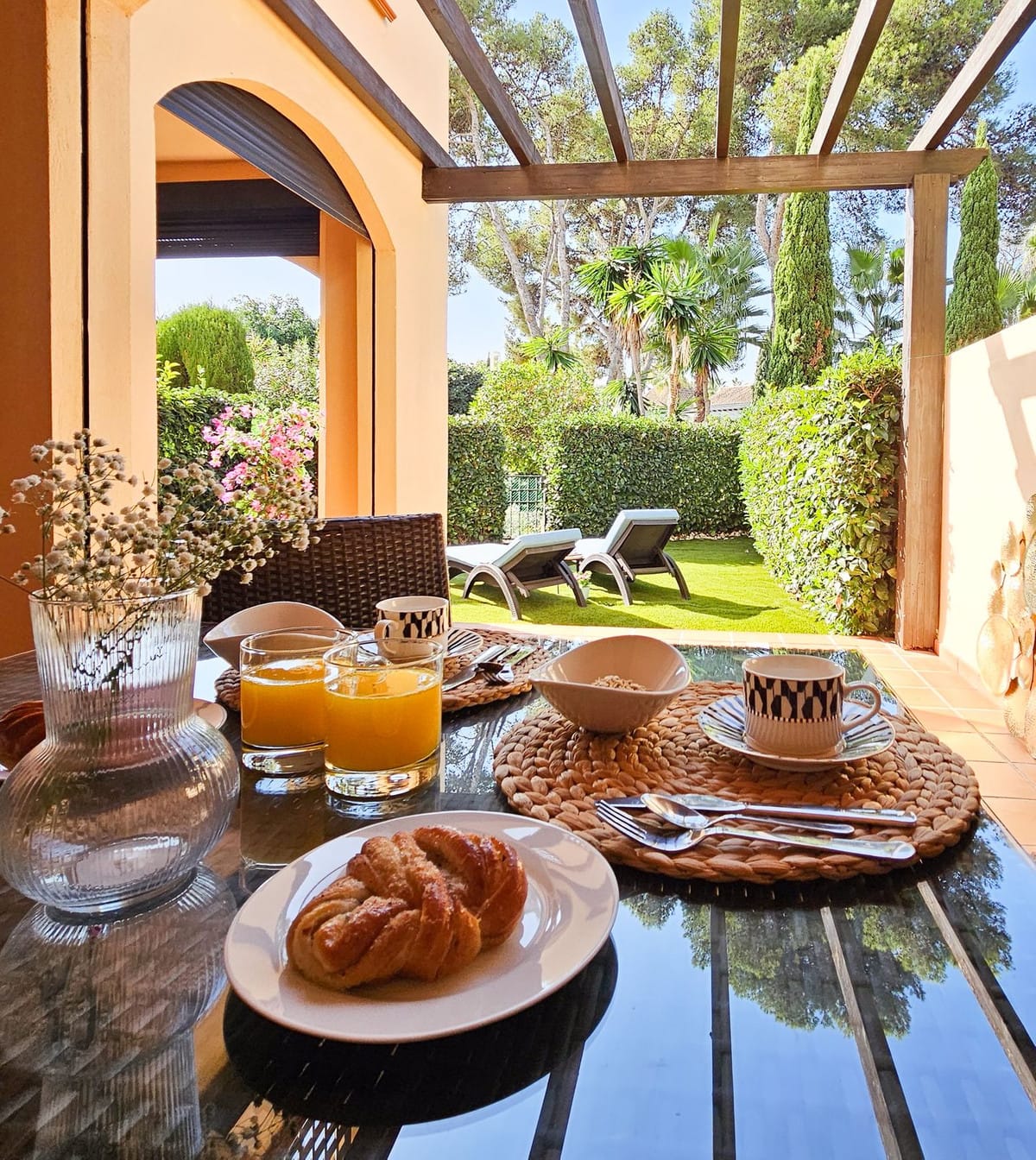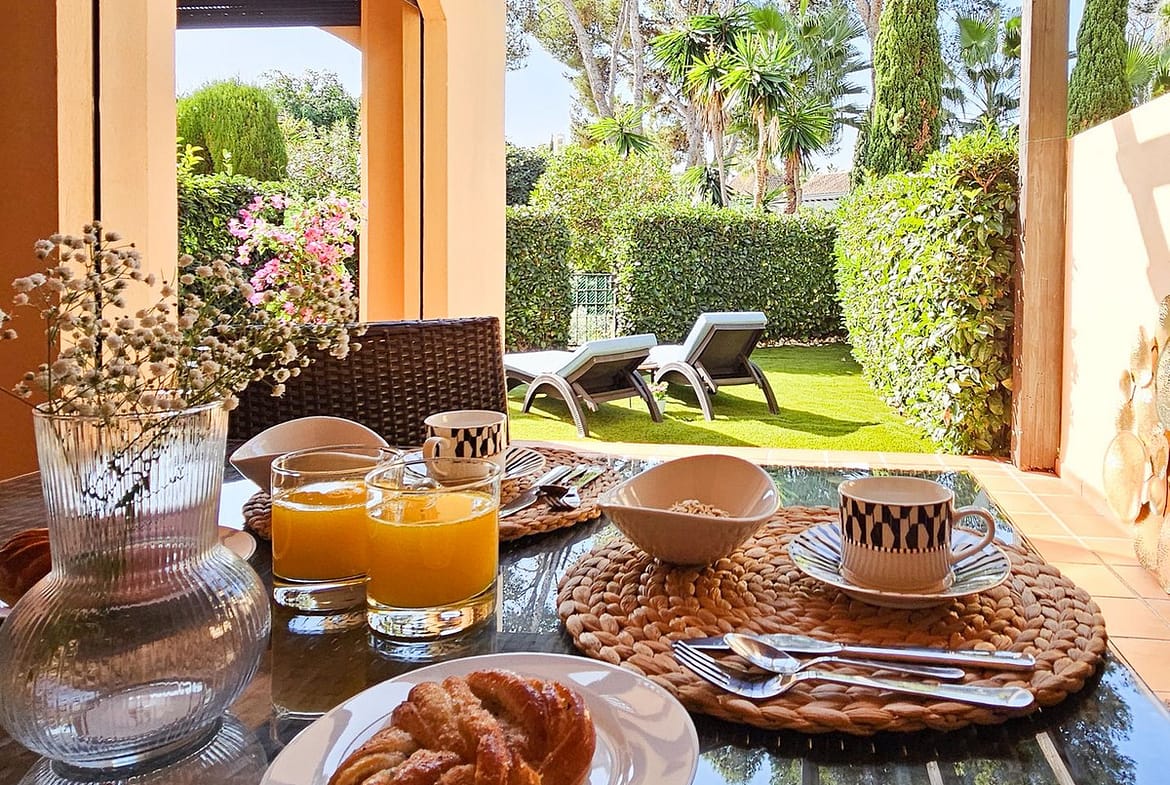 The bright living-dining room opens onto a covered terrace and a private garden, ideal for enjoying the Mediterranean lifestyle.