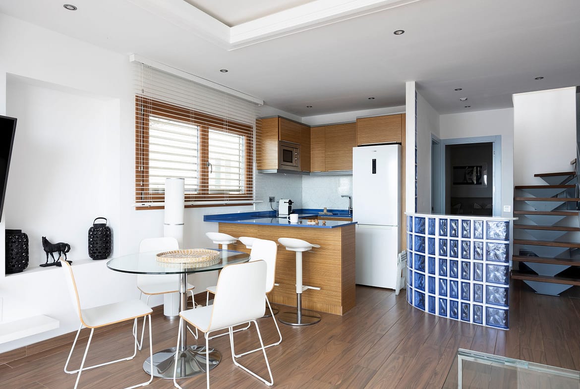 Flooded with natural light and designed with an open-plan concept, the spacious interior seamlessly blends modern elegance with coastal charm. The main floor features a stylish, fully fitted kitchen and bright living area that opens onto a generous terrace — the ideal spot to relax and take in the lively marina atmosphere. This level also includes a comfortable bedroom and a contemporary bathroom.