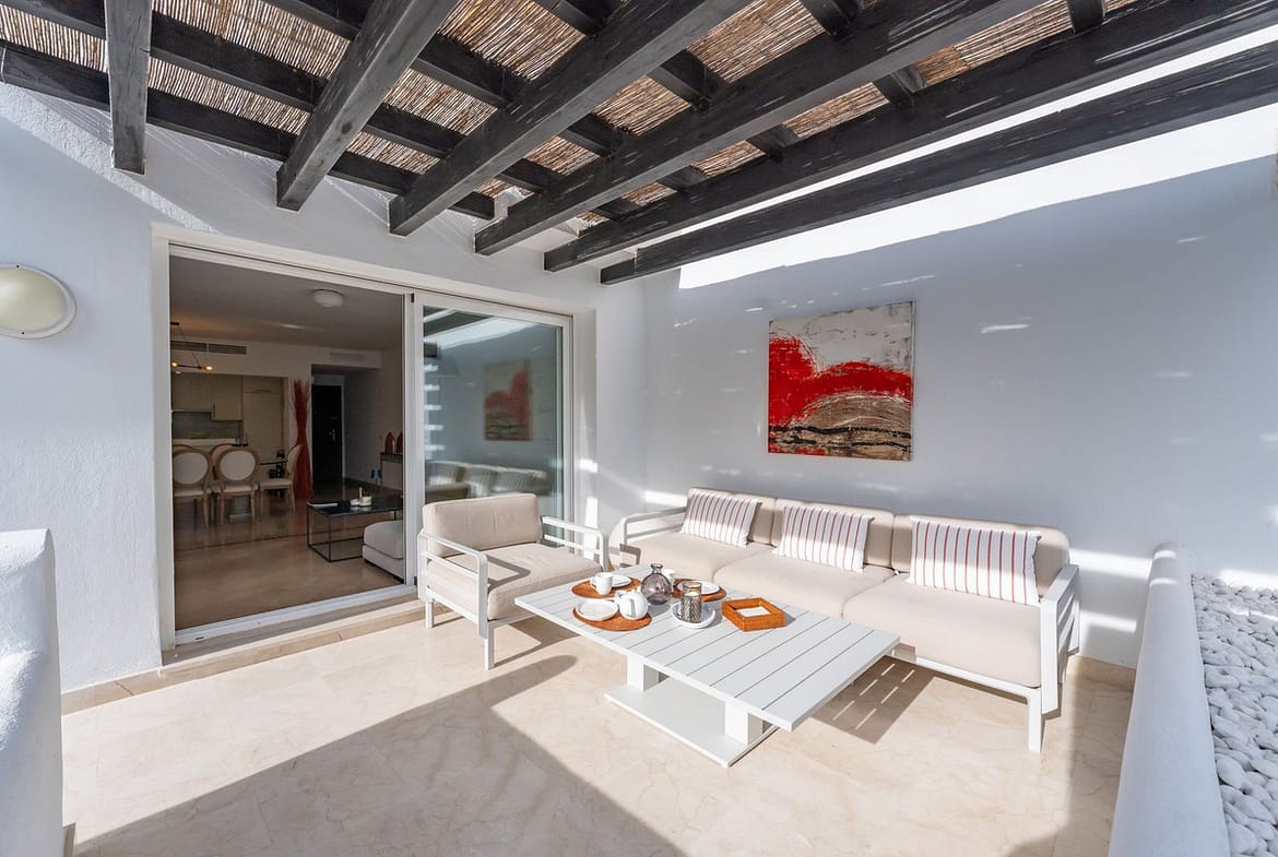 Originally a large one bedroom, this was converted to 2 bedrooms and one bathroom. As you enter the apartment, you are welcomed by the large open hallway that leads straight into the open plan lounge, decorated beautifully with high end furniture and fixtures. A cute white kitchen is to the right of the entrance and opens onto the dining room and lounge. Continue through the lounge and you come to the expansive, beautiful terrace that is facing the pool and south!
