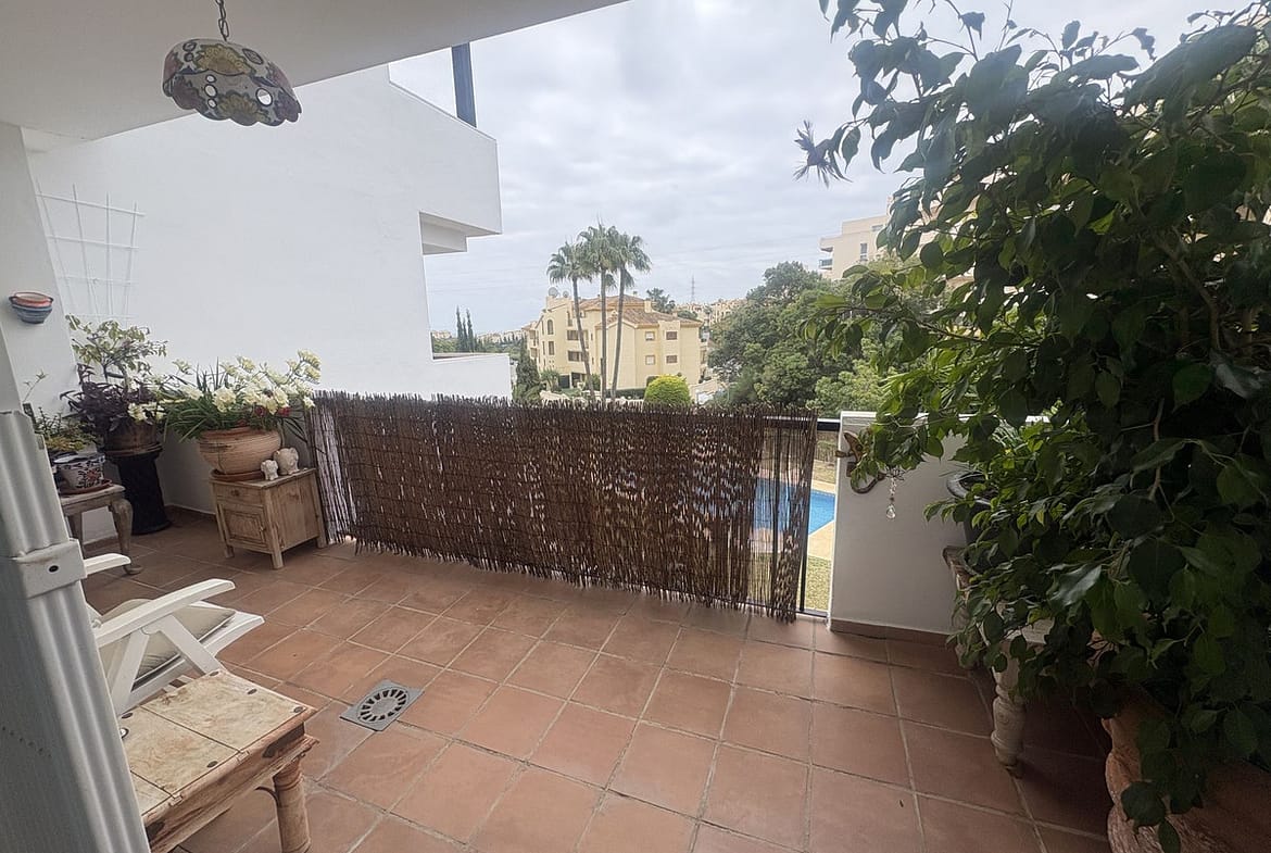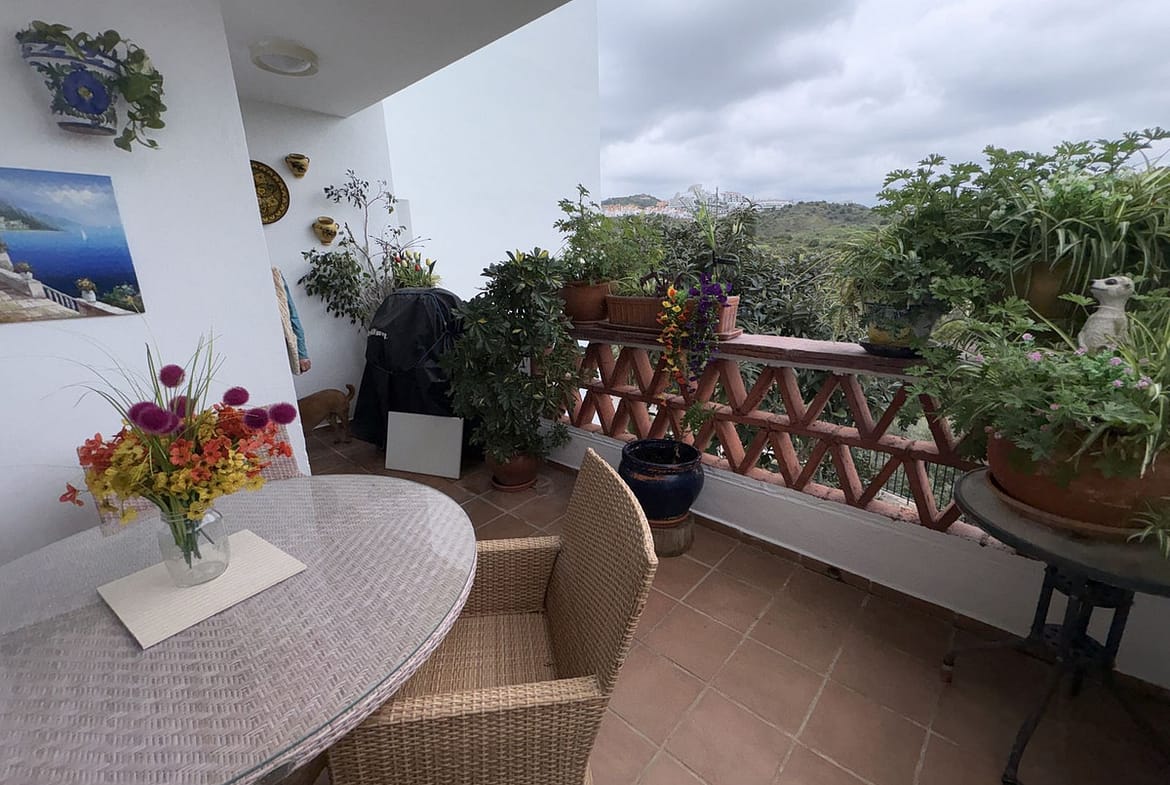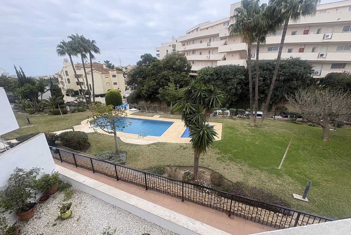 Spacious 1st floor apartment in a lovely community within walking distance to the Miraflores golf course. This apartment gives you two good size bedrooms with fitted wardrobes both with access to the back terrace, the master bedroom there is a large un-suite bathroom that has recently been renovated and there is a smaller 2nd shower room. The kitchen is fully equipped, and it has also been renovated. The living room is large with 2 double doors leading to the front terrace, from there you have sea and pool views. It sold with private parking and storeroom in the communal underground garage.