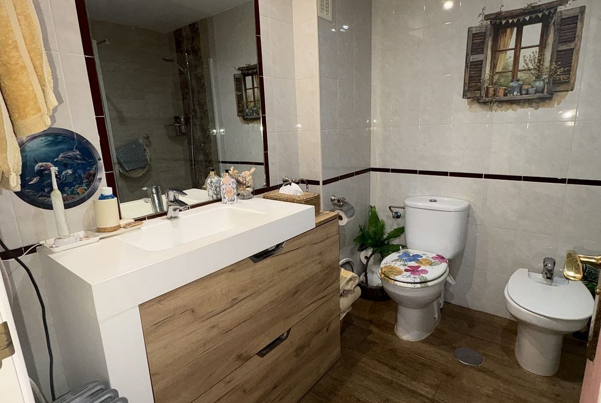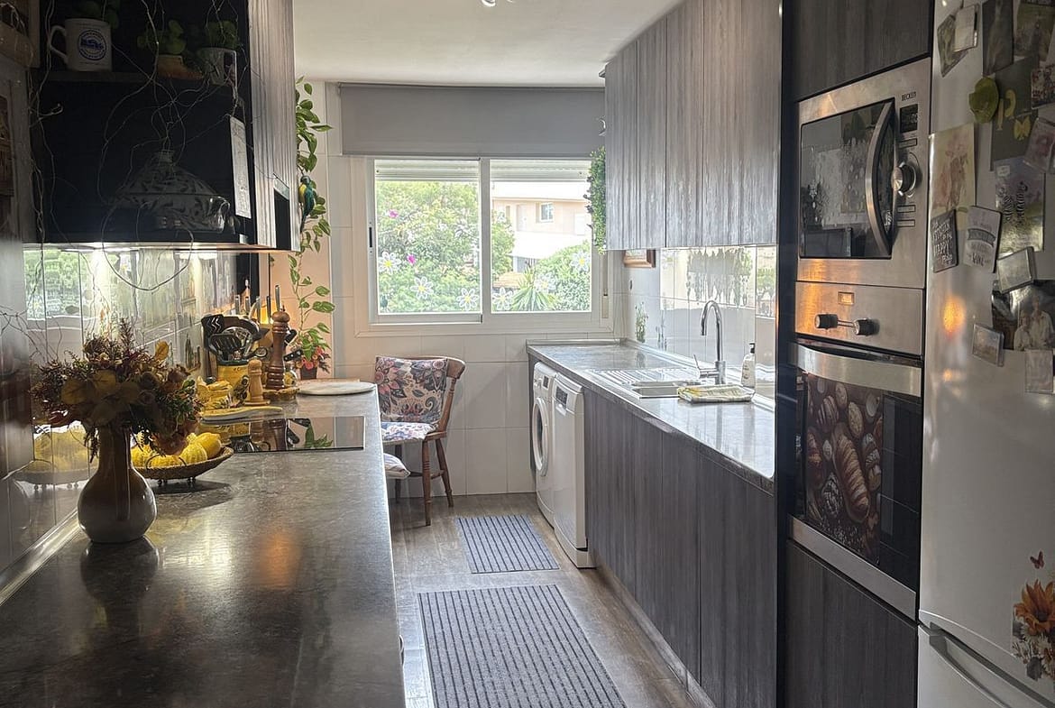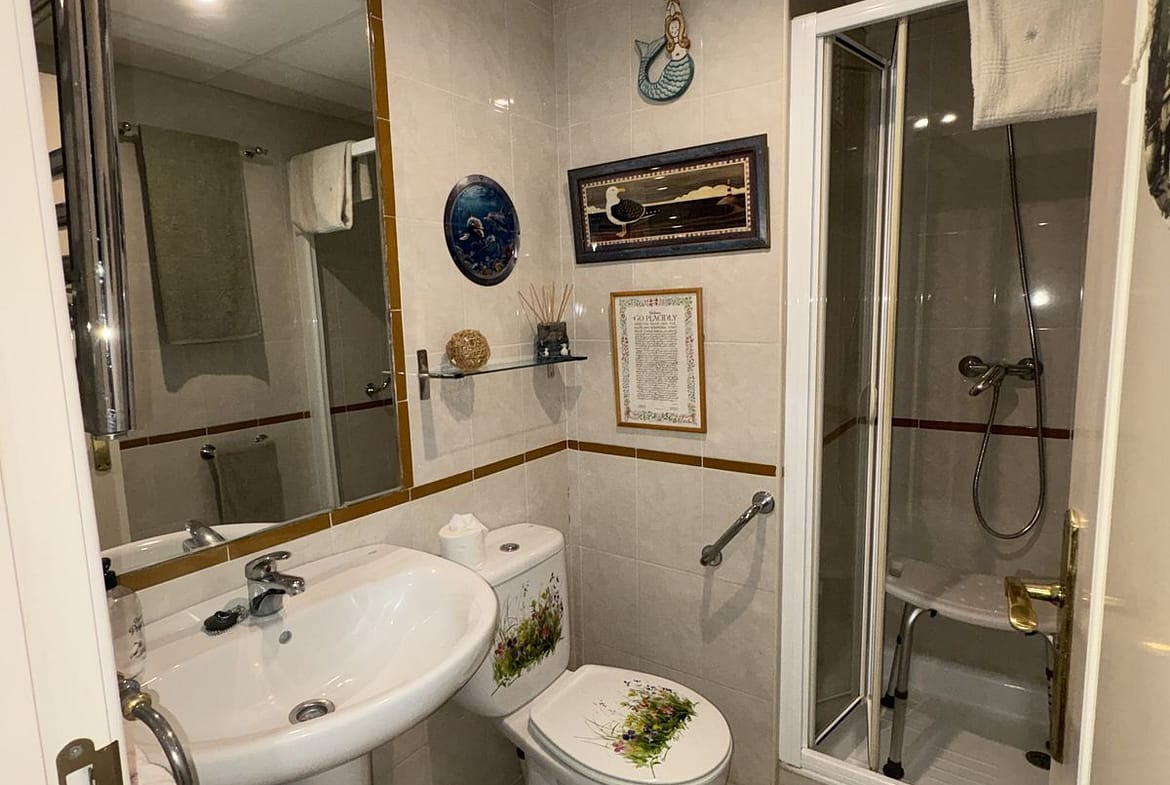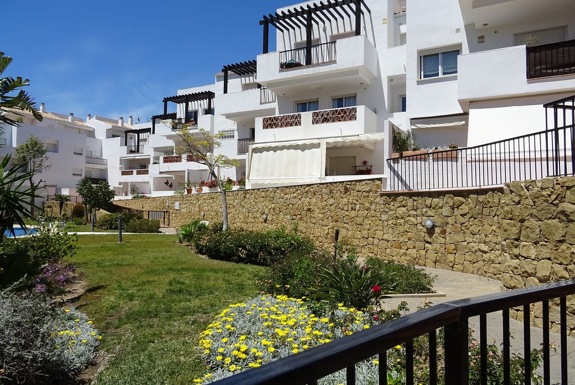 Spacious 1st floor apartment in a lovely community within walking distance to the Miraflores golf course. This apartment gives you two good size bedrooms with fitted wardrobes both with access to the back terrace, the master bedroom there is a large un-suite bathroom that has recently been renovated and there is a smaller 2nd shower room. The kitchen is fully equipped, and it has also been renovated. The living room is large with 2 double doors leading to the front terrace, from there you have sea and pool views. It sold with private parking and storeroom in the communal underground garage.