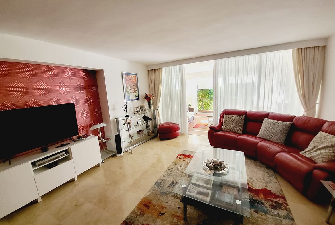EXCEPTIONALLY LARGE AND SPACIOUS 2 BEDROOM 2 BATHROOM APARTMENT SITUATED IN A MUCH SOUGHT AFTER AND EXCLUSIVE COMMUNITY. THE APARTMENT IS A GROUND FLOOR PROPERTY WITH A 50m2 TERRACE THAT LEADS OUT DIRECTLY TO A SMALL PRIVATE GARDEN AREA. THE PROPERTY HAS A HAS A SUNNY SOUTH WESTERLY ASPECT AND OFFERS BOTH SUN AND SHADE. FINISHED TO THE HIGHEST STANDRADS THROUGHOUT THE APARTMENT BRIEFLY COMPRISES: ENTRANCE HALLWAY WITH FITTED WARDROBES FOR STORAGE, SEPARATE GOOD SIZED QUALITY KITCHEN, HUGE OPEN PLAN LOUNGE AND DINING AREA, DOUBLE GUEST BEDROOM WITH FITTED ROBES, GUEST BATHROOM AND A MASTER EN-SUITE BEDROOM WITH FITTED ROBES. THE LOUNGE AND MASTER BEDROOM HAVE DIRECT ACCESS TO THE STUNNING TERRACE AREA WHICH IS USED BY THE CURRENT OWNERS AS AN ADDITIONAL LIVING SPACE AS WELL AS AN INDEPENDENT OFFICE AREA. TASTEFULLY PRESENTED THROUGHOUT IN EXCELLENT CONDITION WITH THE HIGH QUALITY FURNISHINGS BEING INCLUDED IN THE PRICE.