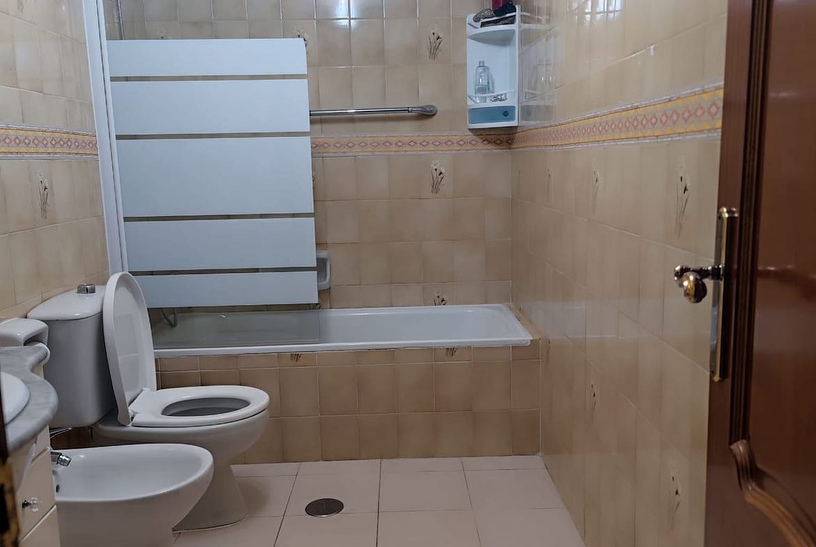 It has a washbasin with vanity unit, large mirror and good ventilation system. The bathroom is complete and very functional, with a bathtub and shower for added convenience.