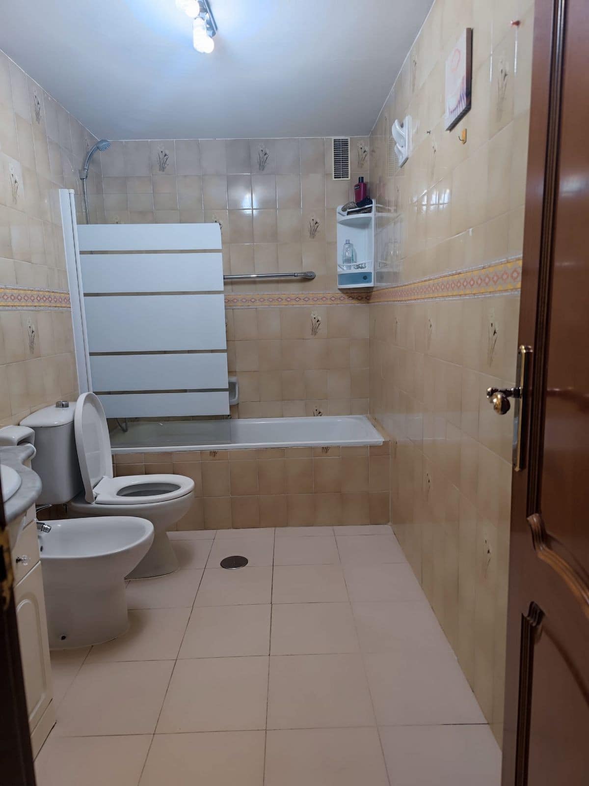 The bathroom is complete and very functional, with a bathtub and shower for added comfort. It has light-coloured wall tiles, which provide brightness and a feeling of cleanliness.