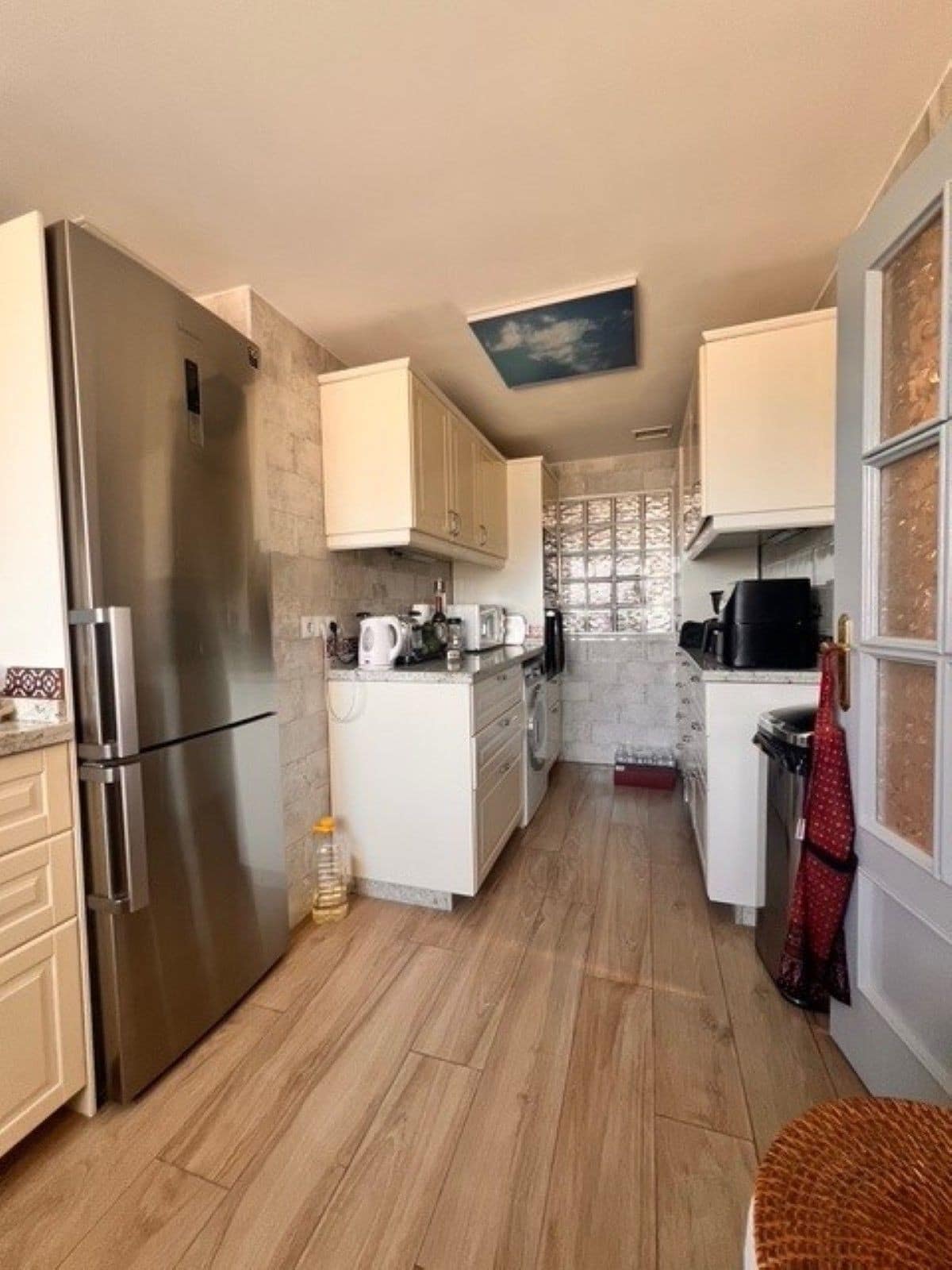 Sustainable living is prioritized with solar panels providing hot water, adding both energy efficiency and eco-consciousness to the property. The apartment also boasts new air conditioning, ensuring comfort year-round.