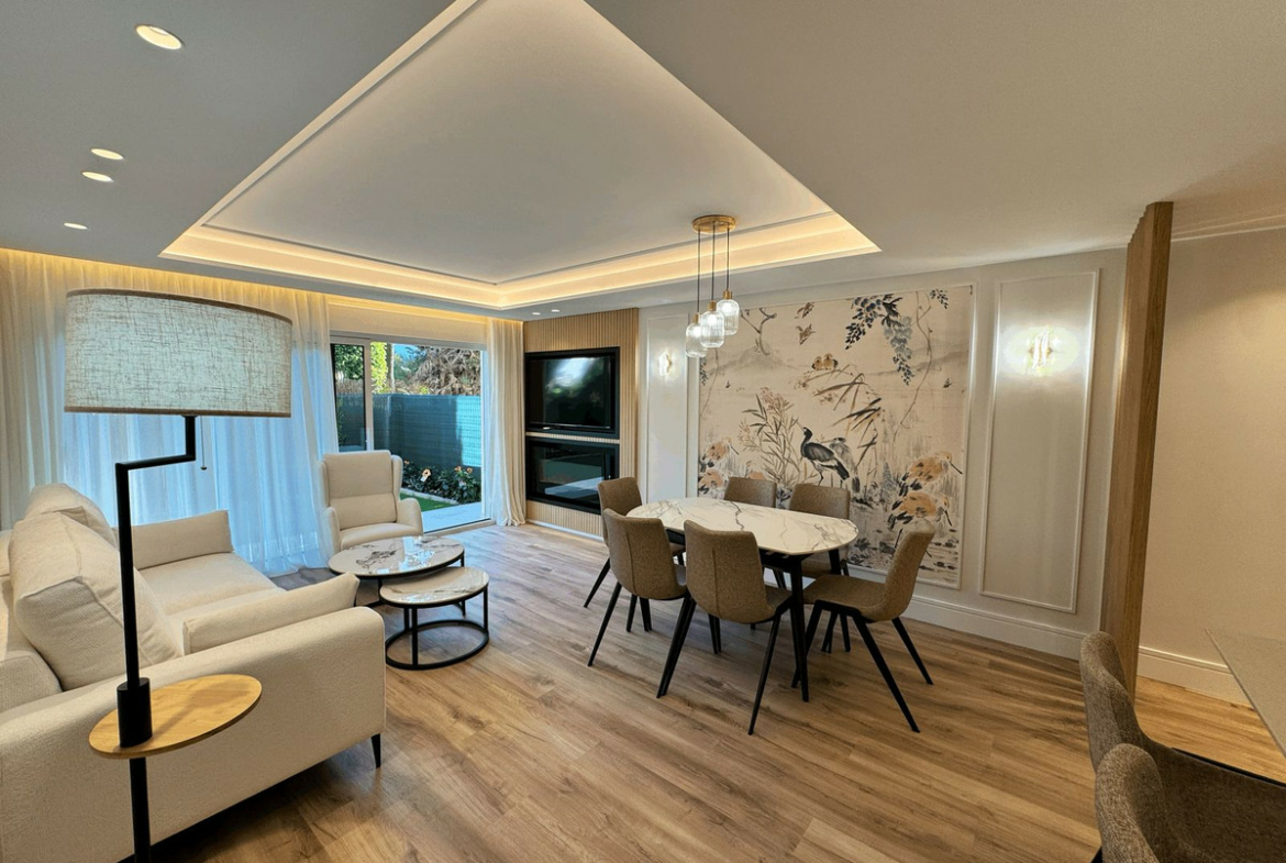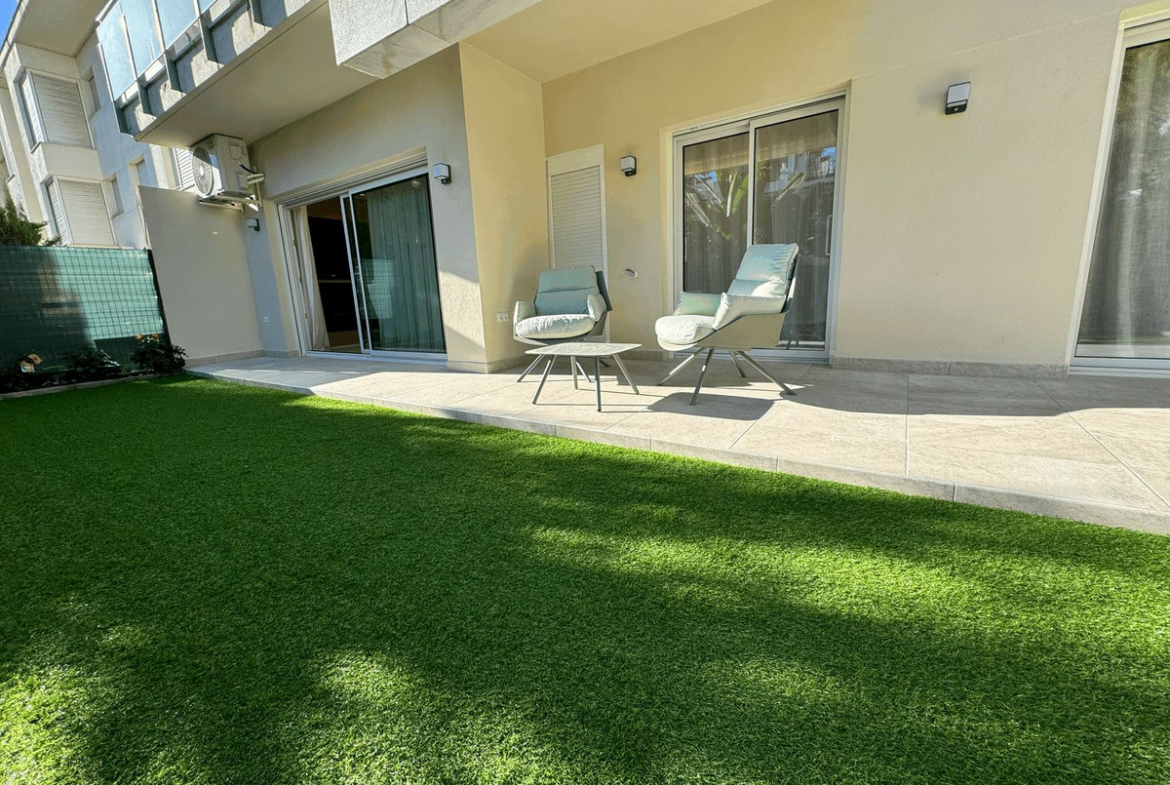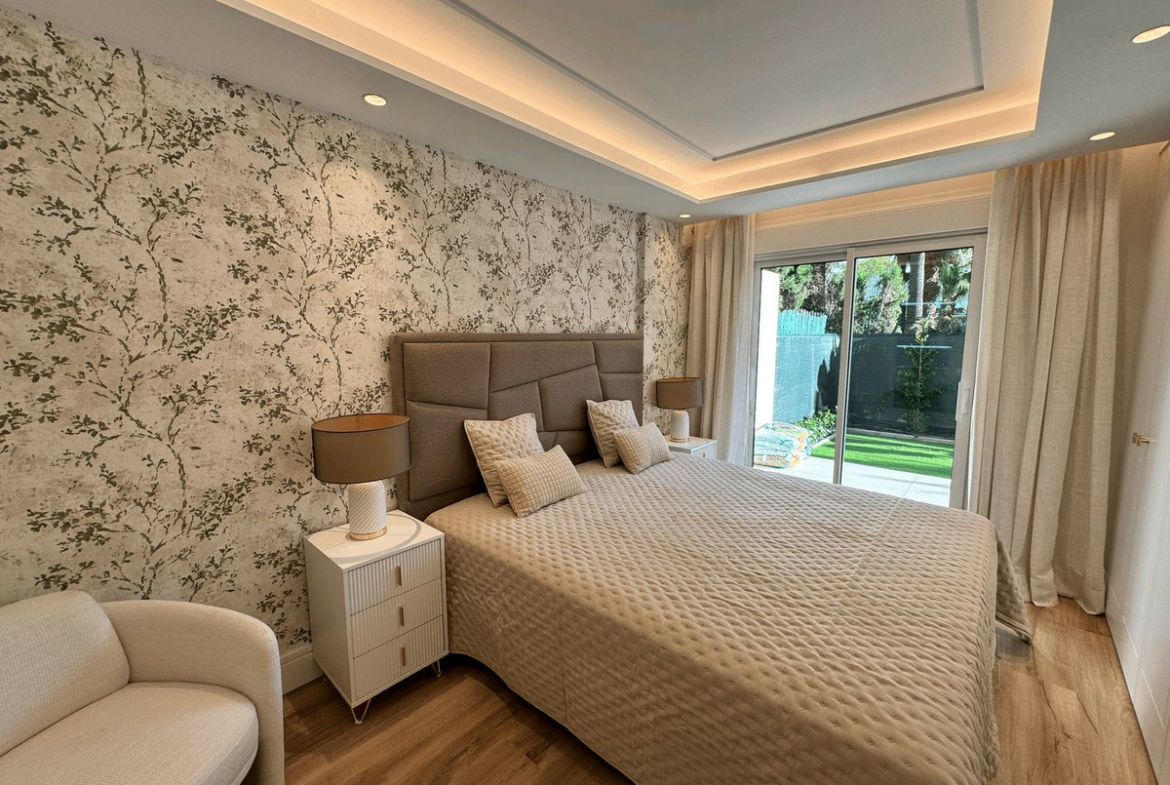 Fully renovated apartment in an urbanization Las Petunias Del Mar, second line beach, steps from the renowned Paseo Marítimo de San Pedro with its restaurants and beach clubs. This ground floor apartment consists of 2 full size bedrooms, 2 bathrooms, a living room with an open kitchen and a private garden. 92 m2 inside and 41 m2 outside. Refurbished to a very high standard, the promoter changed and improved everything, including pipes, electricity, air conditioning and windows with electrical shutters. The property is being sold fully furnished and decorated, key ready
