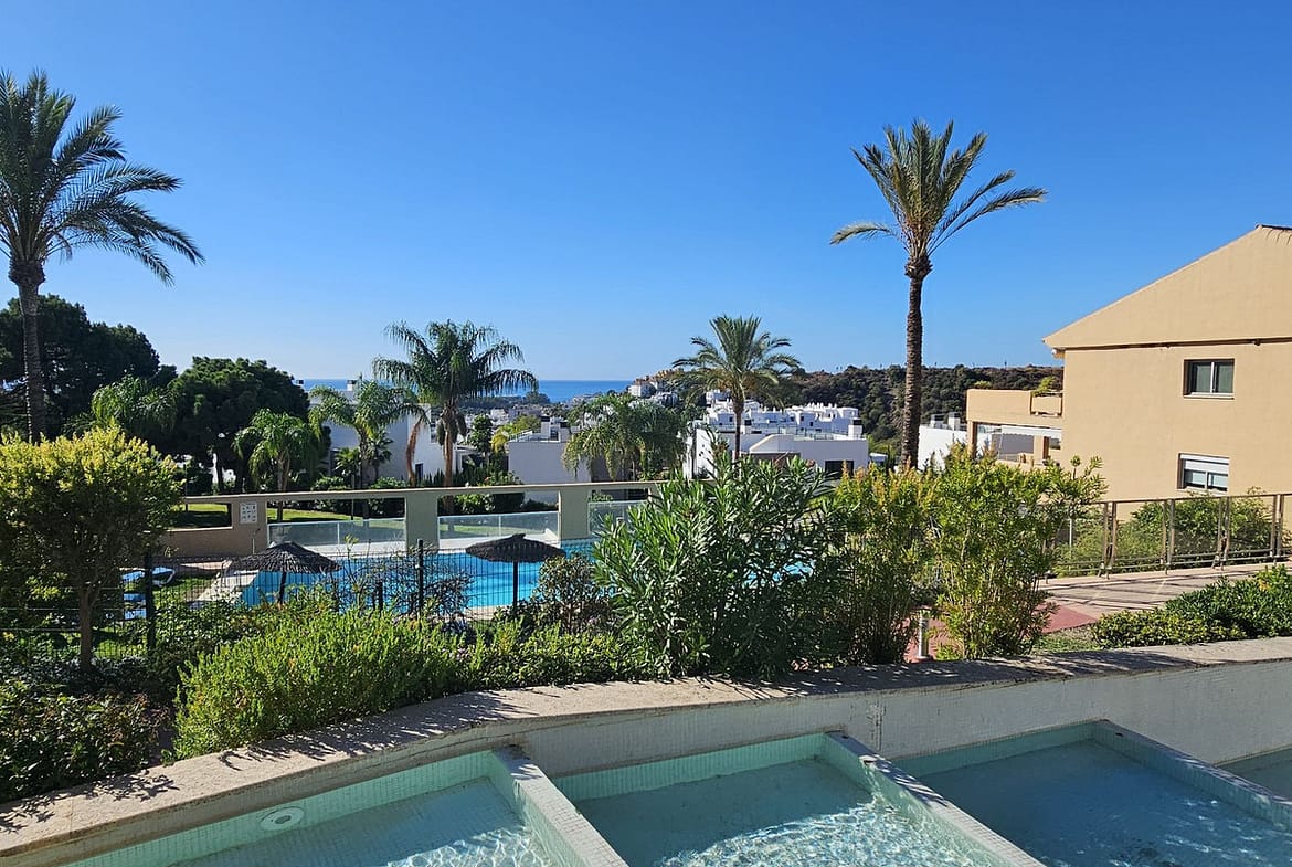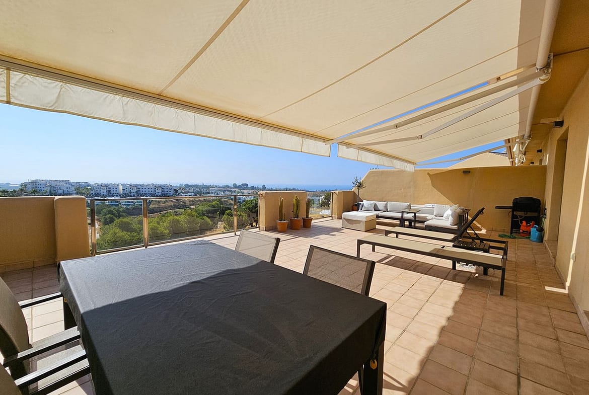 This spacious and bright 2-bedroom penthouse is located in the La Resina area of Estepona, within the golf course. Located in an elegant gated community with 2 swimming pools and beautiful tropical grounds, this apartment offers excellent qualities, tranquillity, sea views, comfort and style. The property really stands out for its amazing uncovered terrace with beautiful panoramic views across the Mediterranean coastline, mountains and golf.