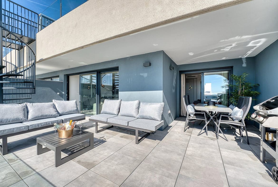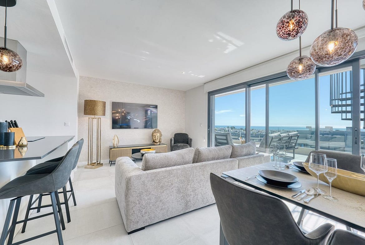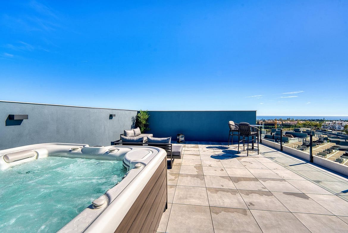 This stylish two-bedroom, two-bathroom apartment offers a spacious terrace with a dining area and lounge, plus an impressive rooftop terrace complete with lounge seating and a jacuzzi. Both terraces provide stunning, uninterrupted sea views stretching all the way to Gibraltar and North Africa.