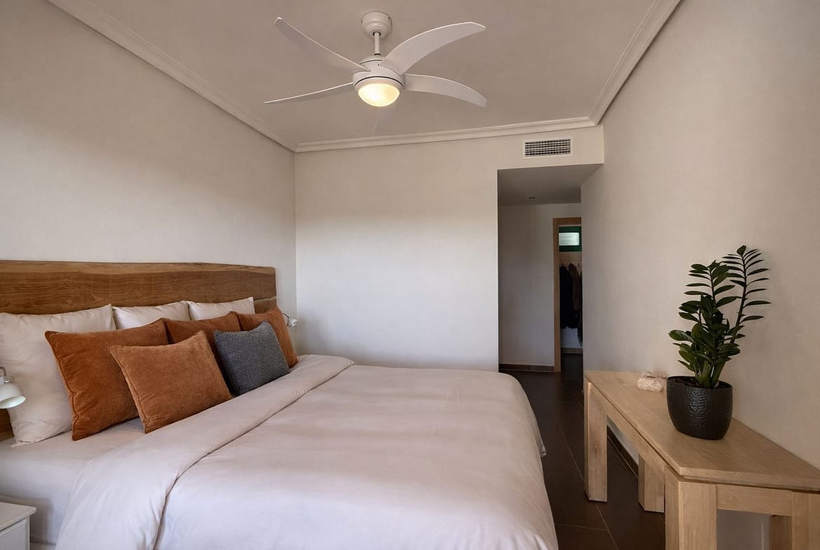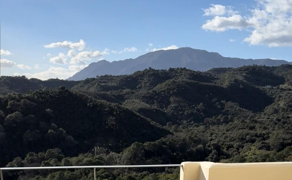 You have beautiful panoramic views of the forest and mountains, as well as some sea views, from this bright and spacious middle-floor apartment, located in a quiet and well-kept community in popular Monte Selwo, east of Estepona. The kitchen is fully equipped with high-end appliances from Neff. The apartment offers 98 m² of living area and a large 60 m² very private southwest-facing terrace where you can enjoy the beautiful landscape in front of you and from where you fantastic sunsets, perfect for relaxing and taking in the beautiful views. The terrace is partly covered and partly open. Inside, you will find a good-sized living room and two bedrooms, with the master bedroom featuring an en-suite bathroom, as well as a total of two bathrooms and a fully equipped independent kitchen. All rooms, including the kitchen, have direct access to the huge terrace. There is a built-in AC system for both cooling and heating. The property also includes a generous underground parking space and an approximately 6 m² storage room. Short-term rentals are not allowed, which keeps the community peaceful and residential. The community fee is very attractive at just €120 per month. The area is especially popular with Nordic residents and offers easy access to shops, services, and main roads. A great option as a permanent home, holiday property, or long-term investment. Located east of Estepona, it is approximately 14 km to Puerto Banús and 12 km to Estepona town.