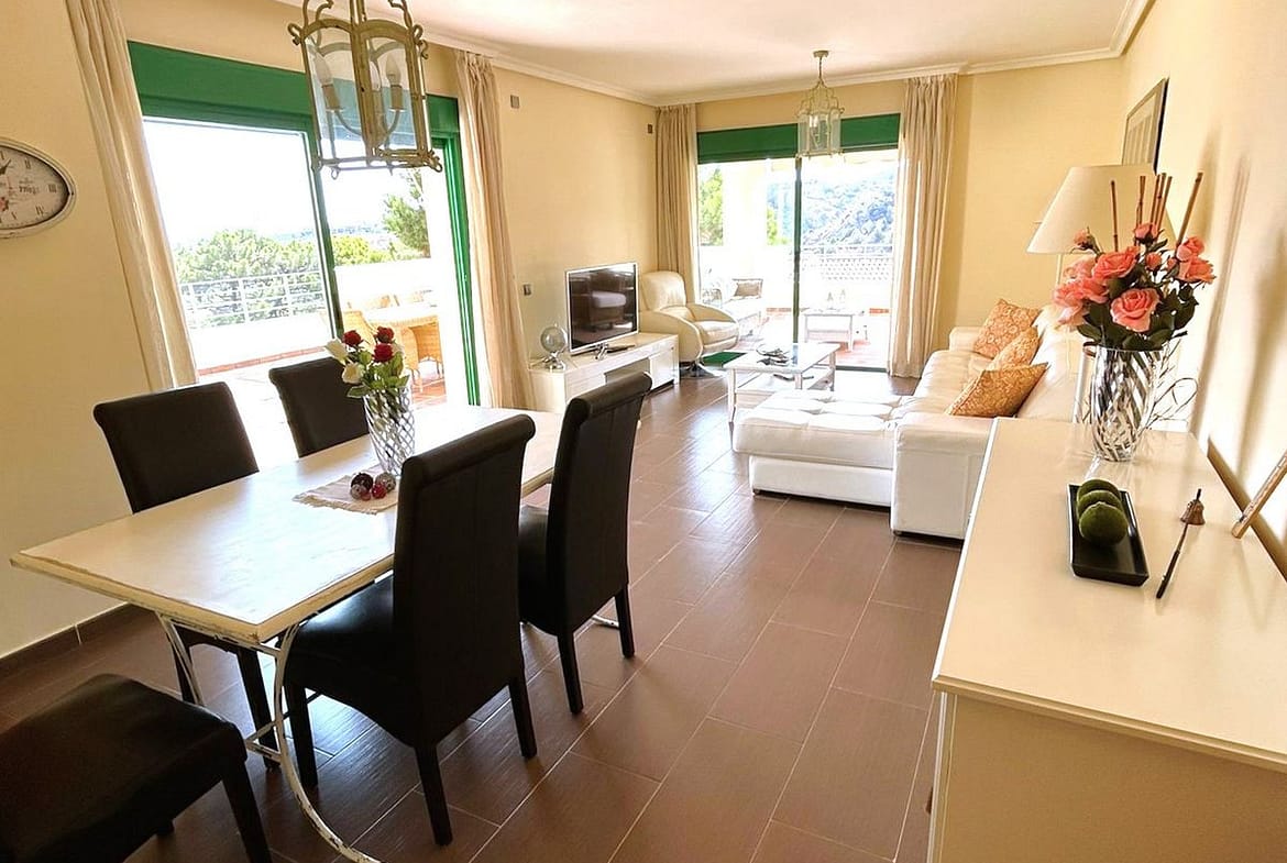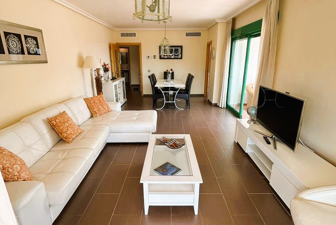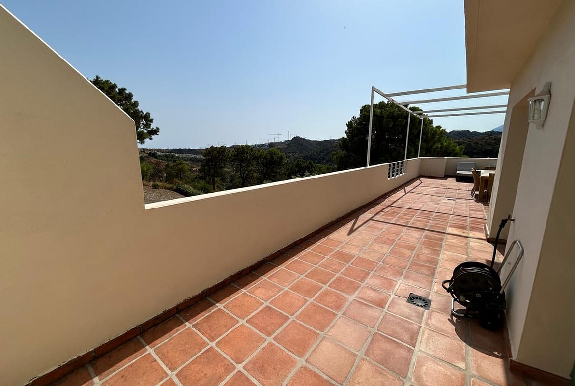Located in Selwo, Estepona, this bright corner apartment, built in 2007, is set within a peaceful and well-maintained community. It features 2 double bedrooms, 2 bathrooms, and a spectacular south and west-facing terrace, perfect for enjoying the spacious outdoor area with stunning mountain views and distant sea views.